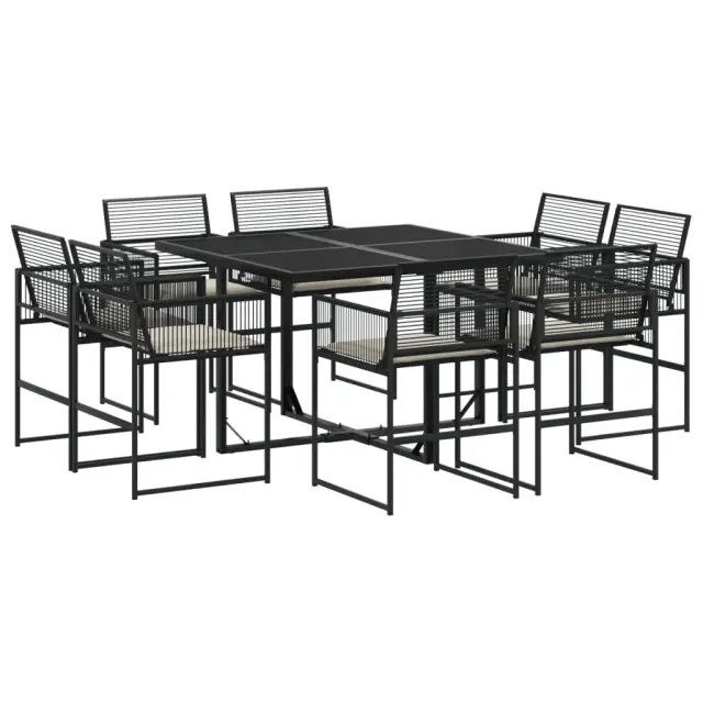 Ta vrtna jedilna garnitura je odlična izbira za večerjo na prostem ali za sprostitev na vrtu, dvorišču ali terasi. Vzdržljiv material: PE ratan, znan tudi kot poli ratan, je močan sintetični material, ki zahteva malo vzdrževanja in je videti kot naravni ratan. Je lahek, enostaven za čiščenje in se zaradi svoje vzdržljivosti in odpornosti na vremenske vplive pogosto uporablja za zunanje pohištvo.Kompaktno shranjevanje: Te vrtne stole je mogoče lepo pospraviti pod mizo in tako prihraniti prostor za shranjevanje.Prevleko je mogoče odstraniti in oprati: Te sedežne blazine imajo odstranljive prevleke za lažje pranje in vzdrževanje.Steklena mizna plošča: Površina zunanje mize je izdelana iz močnega in trpežnega kaljenega stekla, kar omogoča enostavno čiščenje z vlažno krpo in vašemu zunanjemu prostoru doda pridih elegance.Robusten in stabilen okvir: Prašno barvan jekleni okvir zagotavlja, da je vrtno pohištvo močno in stabilno za vsakodnevno uporabo na prostem.Dobro je vedeti:Če želite, da vaše zunanje pohištvo ostane lepo, vam priporočamo, da ga zaščitite z vodoodporno prevleko.Maksimalna nosilnost (na sedež): 110 kgUV-odpornoPotrebno sestavljanje: DaMiza:Barva: ČrnaMaterial: Jeklo s prašnim premazom, kaljeno stekloDimenzije: 110 x 107 x 72 cm (D x Š x V)Stol:Barva: ČrnaMaterial: PE ratan, jeklen okvir s prašnim premazomDimenzije: 50,5 x 51 x 81,5 cm (Š x G x V)Velikost sedeža: 46 x 38 cm (Š x G)Višina sedeža od tal: 44 cmVišina naslonjal za roke, merjena od tal: 63,5 cmBlazina:Barva: Kremno belaMaterial prevleke: Tkanina (100 % poliester)Material polnila: PenaDimenzije blazine za sedež: 46,5 x 37 x 2 cm (Š x G x V)Paket vsebuje:1 x Vrtna miza8 x Vrtni stol8 x Sedežna blazina s snemljivo in pralno prevleko 3295013