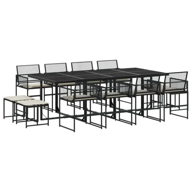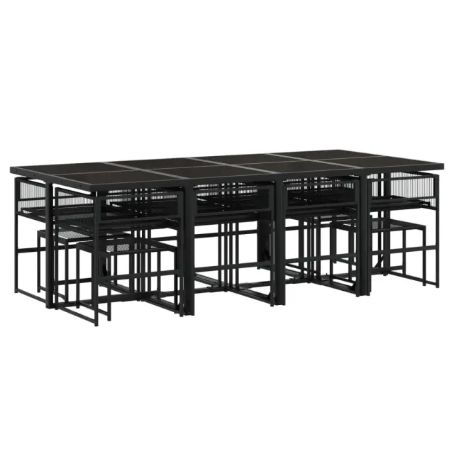 Ta vrtna jedilna garnitura je odlična izbira za večerjo na prostem ali za sprostitev na vrtu, dvorišču ali terasi. Vzdržljiv material: PE ratan, znan tudi kot poli ratan, je močan sintetični material, ki zahteva malo vzdrževanja in je videti kot naravni ratan. Je lahek, enostaven za čiščenje in se zaradi svoje vzdržljivosti in odpornosti na vremenske vplive pogosto uporablja za zunanje pohištvo.Kompaktno shranjevanje: Te vrtne stole je mogoče lepo pospraviti pod mizo in tako prihraniti prostor za shranjevanje.Prevleko je mogoče odstraniti in oprati: Te sedežne blazine imajo odstranljive prevleke za lažje pranje in vzdrževanje.Steklena mizna plošča: Površina zunanje mize je izdelana iz močnega in trpežnega kaljenega stekla, kar omogoča enostavno čiščenje z vlažno krpo in vašemu zunanjemu prostoru doda pridih elegance.Robusten in stabilen okvir: Prašno barvan jekleni okvir zagotavlja, da je vrtno pohištvo močno in stabilno za vsakodnevno uporabo na prostem.Dobro je vedeti:Če želite, da vaše zunanje pohištvo ostane lepo, vam priporočamo, da ga zaščitite z vodoodporno prevleko.Maksimalna nosilnost (na sedež): 110 kgUV-odpornoPotrebno sestavljanje: DaMiza:Barva: ČrnaMaterial: Jeklo s prašnim premazom, kaljeno stekloDimenzije: 220 x 107 x 72 cm (D x Š x V)Stol:Barva: ČrnaMaterial: PE ratan, jeklen okvir s prašnim premazomDimenzije: 50,5 x 51 x 81,5 cm (Š x G x V)Velikost sedeža: 46 x 38 cm (Š x G)Višina sedeža od tal: 44 cmVišina naslonjal za roke, merjena od tal: 63,5 cmStolček:Barva: ČrnaMaterial: PE ratan, jeklen okvir s prašnim premazomDimenzije: 40 x 40 x 35 cm (Š x G x V)Blazina:Barva: Kremno belaMaterial prevleke: Tkanina (100 % poliester)Material polnila: PenaDimenzije blazine za sedež: 46,5 x 37 x 2 cm (Š x G x V)Dimenzije blazine za stolček: 40,5 x 40,5 x 2 cm (Š x G x D)Paket vsebuje:1 x Vrtna miza8 x Vrtni stol4 x Vrtni stolček8 x Sedežna blazina s snemljivo in pralno prevleko4 x Blazina za stolček s snemljivo in pralno prevleko 3295020