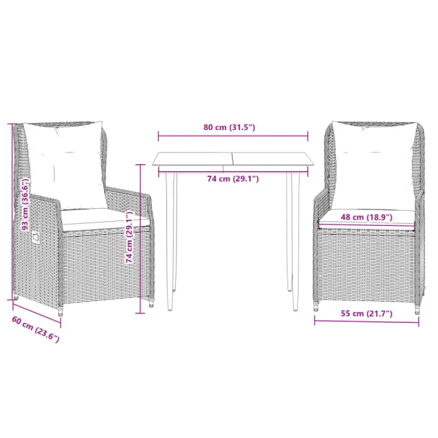 Ta vrtna jedilna garnitura je odlična izbira za večerjo na prostem ali za sprostitev na vrtu, dvorišču ali terasi. Vzdržljiv material: PE ratan, znan tudi kot poli ratan, je močan sintetični material, ki zahteva malo vzdrževanja in je videti kot naravni ratan. Je lahek, enostaven za čiščenje in se zaradi svoje vzdržljivosti in odpornosti na vremenske vplive pogosto uporablja za zunanje pohištvo.Nastavljivo naslonjalo: Ta vrtni sedež ima ročaj. S potegom ročaja lahko naslonjalo nastavite v poljuben položaj in ga hitro vrnete v prvotni položaj.Udobno sedenje: To zunanje pohištvo z debelo oblazinjenimi blazinami zagotavlja udobno sedenje.Prevleko je mogoče odstraniti in oprati: Sedežna blazina ima odstranljivo prevleko za enostavno pranje in vzdrževanje.Steklena mizna plošča: Površina zunanje mize je izdelana iz močnega in trpežnega kaljenega stekla, kar omogoča enostavno čiščenje z vlažno krpo in vašemu zunanjemu prostoru doda pridih elegance. Dobro je vedeti:Če želite, da vaše zunanje pohištvo ostane lepo, vam priporočamo, da ga zaščitite z vodoodporno prevleko.Maksimalna nosilnost (na sedež): 110 kgUV-odpornoPotrebno sestavljanje: DaMiza:Barva: ČrnaMaterial: Jeklo s prašnim premazom, kaljeno stekloDimenzije mize: 80 x 80 x 74 cm (D x Š x V)Vrtni naslanjač:Barva: BežMaterial: PE ratan, jeklen okvir s prašnim premazomDimenzije v sedečem položaju: 55 x 60 x 93 cm (Š x G x V)Dimenzije v ležečem položaju: 55 x 89 x 83 cm (Š x G x V)Velikost sedeža: 48 x 55 cm (Š x G)Višina sedeža, merjena od tal: 42 cmVišina naslonjala za roke, merjena od tal: 58 cmBlazina:Barva: Kremno belaMaterial prevleke: Tkanina (100 % poliester)Polnilo sedežne blazine: PenaPolnilo hrbtne blazine: bombažna vlaknaDimenzije sedežne blazine: 48 x 55 x 3 cm (Š x G x D)Dimenzije hrbtne blazine: 48 x 50 x 10 cm (D x Š x D)Paket vsebuje:1 x Vrtna miza2 x Vrtni stol s funkcijo nagiba2 x Blazina za hrbet2 x Sedežna blazina s snemljivo pralno prevleko 3262882