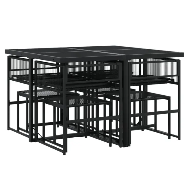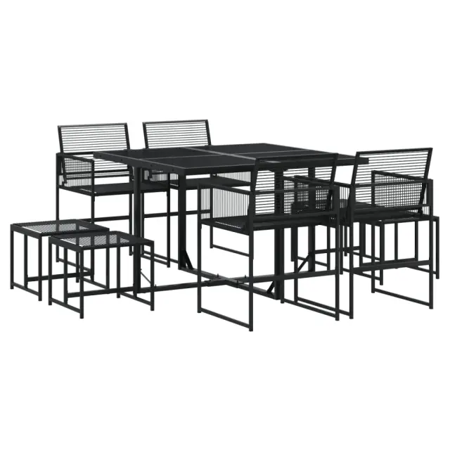 Ta vrtna jedilna garnitura je odlična izbira za večerjo na prostem ali za sprostitev na vrtu, dvorišču ali terasi. Vzdržljiv material: PE ratan, znan tudi kot poli ratan, je močan sintetični material, ki zahteva malo vzdrževanja in je videti kot naravni ratan. Je lahek, enostaven za čiščenje in se zaradi svoje vzdržljivosti in odpornosti na vremenske vplive pogosto uporablja za zunanje pohištvo.Kompaktno shranjevanje: Te vrtne stole je mogoče lepo pospraviti pod mizo in tako prihraniti prostor za shranjevanje.Steklena mizna plošča: Površina zunanje mize je izdelana iz močnega in trpežnega kaljenega stekla, kar omogoča enostavno čiščenje z vlažno krpo in vašemu zunanjemu prostoru doda pridih elegance.Robusten in stabilen okvir: Prašno barvan jekleni okvir zagotavlja, da je vrtno pohištvo močno in stabilno za vsakodnevno uporabo na prostem.Dobro je vedeti:Če želite, da vaše zunanje pohištvo ostane lepo, vam priporočamo, da ga zaščitite z vodoodporno prevleko.Maksimalna nosilnost (na sedež): 110 kgUV-odpornoPotrebno sestavljanje: DaMiza:Barva: ČrnaMaterial: Jeklo s prašnim premazom, kaljeno stekloDimenzije: 110 x 107 x 72 cm (D x Š x V)Stol:Barva: ČrnaMaterial: PE ratan, jeklen okvir s prašnim premazomDimenzije: 50,5 x 51 x 81,5 cm (Š x G x V)Velikost sedeža: 46 x 38 cm (Š x G)Višina sedeža od tal: 44 cmVišina naslonjal za roke, merjena od tal: 63,5 cmStolček:Barva: ČrnaMaterial: PE ratan, jeklen okvir s prašnim premazomDimenzije: 40 x 40 x 35 cm (Š x G x V)Paket vsebuje:1 x Vrtna miza4 x Vrtni stol4 x Vrtni stolček 3295043
