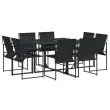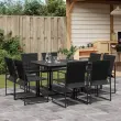 Ta vrtna jedilna garnitura je odlična izbira za večerjo na prostem ali za sprostitev na vrtu, dvorišču ali terasi. Trpežno in dolgotrajno: Zaradi svoje trajnosti, odpornosti na vodo in bledenje, enostavnega vzdrževanja ter zaščite pred UV žarki in plesnijo je tkanina iz tekstilena idealna izbira za zunanje pohištvo in konstrukcije za zagotavljanje sence.Kompaktno shranjevanje: Te stole je mogoče zložiti, zato jih je enostavno shraniti pod mizo.Steklena mizna plošča: Površina zunanje mize je izdelana iz močnega in trpežnega kaljenega stekla, kar omogoča enostavno čiščenje z vlažno krpo in vašemu zunanjemu prostoru doda pridih elegance.Robusten in stabilen okvir: Prašno barvan jekleni okvir zagotavlja, da je vrtno pohištvo močno in stabilno za vsakodnevno uporabo na prostem.Dobro je vedeti:Če želite, da vaše zunanje pohištvo ostane lepo, vam priporočamo, da ga zaščitite z vodoodporno prevleko.Maksimalna nosilnost (na sedež): 110 kgUV-odpornoPotrebno sestavljanje: DaMiza:Barva: ČrnaMaterial: Jeklo s prašnim premazom, kaljeno stekloDimenzije: 110 x 107 x 72 cm (D x Š x V)Stol:Barva: ČrnaMaterial: PE ratan, jeklen okvir s prašnim premazomDimenzije: 50 x 55 x 84 cm (Š x G x V)Velikost sedeža: 42 x 41 cm (Š x G)Višina sedeža od tal: 44 cmVišina naslonjala za roke, merjena od tal: 64 cmPaket vsebuje:1 x Vrtna miza8 x Vrtni stol 3295123