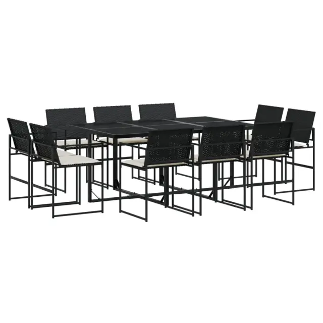 Ta vrtna jedilna garnitura je odlična izbira za večerjo na prostem ali za sprostitev na vrtu, dvorišču ali terasi. Vzdržljiv material: PE ratan, znan tudi kot poli ratan, je močan sintetični material, ki zahteva malo vzdrževanja in je videti kot naravni ratan. Je lahek, enostaven za čiščenje in se zaradi svoje vzdržljivosti in odpornosti na vremenske vplive pogosto uporablja za zunanje pohištvo.Kompaktno shranjevanje: Te stole je mogoče zložiti, zato jih je enostavno shraniti pod mizo. Ko so zloženi, se lepo prilegajo pod mizo in tvorijo prostorsko varčno kocko.Prevleko je mogoče odstraniti in oprati: Te sedežne blazine imajo odstranljive prevleke za lažje pranje in vzdrževanje.Steklena mizna plošča: Površina zunanje mize je izdelana iz močnega in trpežnega kaljenega stekla, kar omogoča enostavno čiščenje z vlažno krpo in vašemu zunanjemu prostoru doda pridih elegance.Robusten in stabilen okvir: Prašno barvan jekleni okvir zagotavlja, da je vrtno pohištvo močno in stabilno za vsakodnevno uporabo na prostem.Dobro je vedeti:Če želite, da vaše zunanje pohištvo ostane lepo, vam priporočamo, da ga zaščitite z vodoodporno prevleko.Maksimalna nosilnost (na sedež): 110 kgUV-odpornoPotrebno sestavljanje: DaMiza:Barva: ČrnaMaterial: Jeklo s prašnim premazom, kaljeno stekloDimenzije: 165 x 107 x 72 cm (D x Š x V)Stol:Barva: ČrnaMaterial: PE ratan, jeklen okvir s prašnim premazomDimenzije: 50,5 x 51 x 81,5 cm (Š x G x V)Velikost sedeža: 46 x 38 cm (Š x G)Višina sedeža od tal: 44 cmVišina naslonjal za roke, merjena od tal: 63,5 cmBlazina:Barva: Kremno belaMaterial prevleke: Tkanina (100 % poliester)Material polnila: PenaDimenzije blazine za sedež: 46,5 x 37 x 2 cm (Š x G x V)Paket vsebuje:1 x Vrtna miza10 x Vrtni stol10 x Sedežna blazina s snemljivo in pralno prevleko 3295064