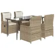 Ta vrtna jedilna garnitura je odlična izbira za večerjo na prostem ali za sprostitev na vrtu, dvorišču ali terasi. Vzdržljiv material: PE ratan, znan tudi kot poli ratan, je močan sintetični material, ki zahteva malo vzdrževanja in je videti kot naravni ratan. Je lahek, enostaven za čiščenje in se zaradi svoje vzdržljivosti in odpornosti na vremenske vplive pogosto uporablja za zunanje pohištvo.Nastavljivo naslonjalo: Ta vrtni sedež ima ročaj. S potegom ročaja lahko naslonjalo nastavite v poljuben položaj in ga hitro vrnete v prvotni položaj.Udobno sedenje: To zunanje pohištvo z debelo oblazinjenimi blazinami zagotavlja udobno sedenje.Prevleko je mogoče odstraniti in oprati: Sedežna blazina ima odstranljivo prevleko za enostavno pranje in vzdrževanje.Steklena mizna plošča: Površina zunanje mize je izdelana iz močnega in trpežnega kaljenega stekla, kar omogoča enostavno čiščenje z vlažno krpo in vašemu zunanjemu prostoru doda pridih elegance. Dobro je vedeti:Če želite, da vaše zunanje pohištvo ostane lepo, vam priporočamo, da ga zaščitite z vodoodporno prevleko.Maksimalna nosilnost (na sedež): 110 kgUV-odpornoPotrebno sestavljanje: DaMiza:Barva: ČrnaMaterial: Jeklo s prašnim premazom, kaljeno stekloDimenzije mize: 160 x 80 x 74 cm (D x Š x V)Vrtni naslanjač:Barva: BežMaterial: PE ratan, jeklen okvir s prašnim premazomDimenzije v sedečem položaju: 55 x 60 x 93 cm (Š x G x V)Dimenzije v ležečem položaju: 55 x 89 x 83 cm (Š x G x V)Velikost sedeža: 48 x 55 cm (Š x G)Višina sedeža, merjena od tal: 42 cmVišina naslonjala za roke, merjena od tal: 58 cmBlazina:Barva: Kremno belaMaterial prevleke: Tkanina (100 % poliester)Polnilo sedežne blazine: PenaPolnilo hrbtne blazine: bombažna vlaknaDimenzije sedežne blazine: 48 x 55 x 3 cm (Š x G x D)Dimenzije hrbtne blazine: 48 x 50 x 10 cm (D x Š x D)Paket vsebuje:1 x Vrtna miza4 x Vrtni stol s funkcijo nagiba4 x Blazina za hrbet4 x Sedežna blazina s snemljivo in pralno prevleko 3262885