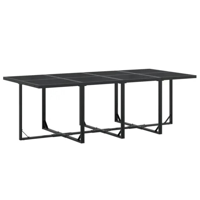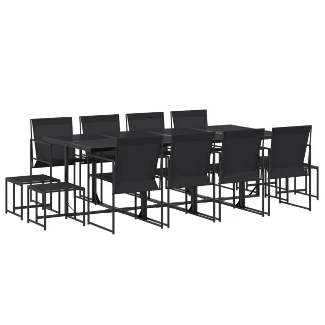Ta vrtna jedilna garnitura je odlična izbira za večerjo na prostem ali za sprostitev na vrtu, dvorišču ali terasi. Trpežno in dolgotrajno: Zaradi svoje trajnosti, odpornosti na vodo in bledenje, enostavnega vzdrževanja ter zaščite pred UV žarki in plesnijo je tkanina iz tekstilena idealna izbira za zunanje pohištvo in konstrukcije za zagotavljanje sence.Kompaktno shranjevanje: Te stole je mogoče zložiti, zato jih je enostavno shraniti pod mizo.Steklena mizna plošča: Površina zunanje mize je izdelana iz močnega in trpežnega kaljenega stekla, kar omogoča enostavno čiščenje z vlažno krpo in vašemu zunanjemu prostoru doda pridih elegance.Robusten in stabilen okvir: Prašno barvan jekleni okvir zagotavlja, da je vrtno pohištvo močno in stabilno za vsakodnevno uporabo na prostem.Dobro je vedeti:Če želite, da vaše zunanje pohištvo ostane lepo, vam priporočamo, da ga zaščitite z vodoodporno prevleko.Maksimalna nosilnost (na sedež): 110 kgUV-odpornoPotrebno sestavljanje: DaMiza:Barva: ČrnaMaterial: Jeklo s prašnim premazom, kaljeno stekloDimenzije: 220 x 107 x 72 cm (D x Š x V)Stol:Barva: ČrnaMaterial: PE ratan, jeklen okvir s prašnim premazomDimenzije: 50 x 55 x 84 cm (Š x G x V)Velikost sedeža: 42 x 41 cm (Š x G)Višina sedeža od tal: 44 cmVišina naslonjala za roke, merjena od tal: 64 cmStolček:Barva: ČrnaMaterial: PE ratan, jeklen okvir s prašnim premazomDimenzije: 40 x 40 x 35 cm (Š x G x V)Paket vsebuje:1 x Vrtna miza8 x Vrtni stol4 x Vrtni stolček 3295130