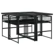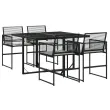 Ta vrtna jedilna garnitura je odlična izbira za večerjo na prostem ali za sprostitev na vrtu, dvorišču ali terasi. Vzdržljiv material: PE ratan, znan tudi kot poli ratan, je močan sintetični material, ki zahteva malo vzdrževanja in je videti kot naravni ratan. Je lahek, enostaven za čiščenje in se zaradi svoje vzdržljivosti in odpornosti na vremenske vplive pogosto uporablja za zunanje pohištvo. Steklena mizna plošča: Površina zunanje mize je izdelana iz močnega in trpežnega kaljenega stekla, kar omogoča enostavno čiščenje z vlažno krpo in vašemu zunanjemu prostoru doda pridih elegance. Kompaktno shranjevanje: Te stole je mogoče zložiti, zato jih je enostavno shraniti pod mizo. Ko so zloženi, se lepo prilegajo pod mizo in tvorijo prostorsko varčno kocko. Udobno sedenje: To zunanje pohištvo z debelo oblazinjenimi blazinami zagotavlja udobno sedenje. Dobro je vedeti:Če želite, da vaše zunanje pohištvo ostane lepo, vam priporočamo, da ga zaščitite z vodoodporno prevleko.Maksimalna nosilnost (na sedež): 110 kgUV-odpornoPotrebno sestavljanje: DaMiza:Barva: ČrnaMaterial: PE ratan, jeklo s prašnim premazom, stekloDimenzije: 110 x 107 x 72 cm (D x Š x V)Stol:Barva: ČrnaMaterial: PE ratan, jeklen okvir s prašnim premazomDimenzije: 50,5 x 51 x 81,5 cm (Š x G x V)Velikost sedeža: 47 x 38 cm (Š x G)Višina sedeža od tal: 44 cmVišina naslonjala za roke od tal: 65 cmBlazina:Barva: Kremno belaMaterial prevleke: Tkanina (100 % poliester)Material polnila: PenaDimenzije sedežne blazine: 47 x 38 x 2 cm (Š x G x D)Paket vsebuje:1 x Vrtna miza4 x Vrtni stol4 x Blazina za sedež 3295023
