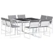 Ta vrtna jedilna garnitura je odlična izbira za večerjo na prostem ali za sprostitev na vrtu, dvorišču ali terasi. Trpežno in dolgotrajno: Zaradi svoje trajnosti, odpornosti na vodo in bledenje, enostavnega vzdrževanja ter zaščite pred UV žarki in plesnijo je tkanina iz tekstilena idealna izbira za zunanje pohištvo in konstrukcije za zagotavljanje sence.Kompaktno shranjevanje: Te stole je mogoče zložiti, zato jih je enostavno shraniti pod mizo. Ko so zloženi, se lepo prilegajo pod mizo in tvorijo prostorsko varčno kocko.Prevleko je mogoče odstraniti in oprati: Te sedežne blazine imajo odstranljive prevleke za lažje pranje in vzdrževanje.Steklena mizna plošča: Površina zunanje mize je izdelana iz močnega in trpežnega kaljenega stekla, kar omogoča enostavno čiščenje z vlažno krpo in vašemu zunanjemu prostoru doda pridih elegance.Robusten in stabilen okvir: Prašno barvan jekleni okvir zagotavlja, da je vrtno pohištvo močno in stabilno za vsakodnevno uporabo na prostem.Dobro je vedeti:Če želite, da vaše zunanje pohištvo ostane lepo, vam priporočamo, da ga zaščitite z vodoodporno prevleko.Maksimalna nosilnost (na sedež): 110 kgUV-odpornoPotrebno sestavljanje: DaMiza:Barva: BelaMaterial: Jeklo s prašnim premazom, kaljeno stekloDimenzije: 110 x 107 x 72 cm (D x Š x V)Stol:Barva: BelaMaterial: Tekstilen, jeklo s prašnim premazomDimenzije: 50,5 x 51 x 81,5 cm (Š x G x V)Velikost sedeža: 46 x 38 cm (Š x G)Višina sedeža od tal: 44 cmVišina naslonjal za roke, merjena od tal: 63,5 cmBlazina:Barva: Svetlo sivaMaterial prevleke: Tkanina (100 % poliester)Material polnila: PenaDimenzije blazine za sedež: 46,5 x 37 x 2 cm (Š x G x V)Dimenzije hrbtne blazine: 45,5 x 43,5 x 2,5 cm (D × Š × D)Paket vsebuje:1 x Vrtna miza8 x Vrtni stol8 x Sedežna blazina s snemljivo in pralno prevleko8 x Blazina za hrbet 3295093