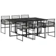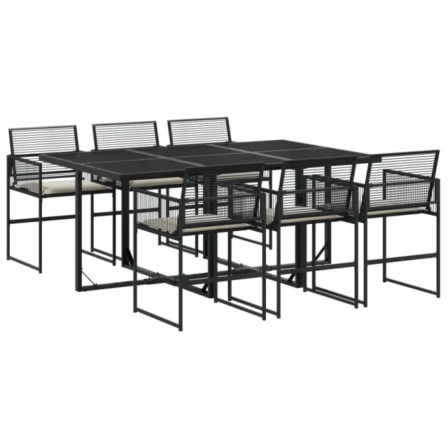 Ta vrtna jedilna garnitura je odlična izbira za večerjo na prostem ali za sprostitev na vrtu, dvorišču ali terasi. Vzdržljiv material: PE ratan, znan tudi kot poli ratan, je močan sintetični material, ki zahteva malo vzdrževanja in je videti kot naravni ratan. Je lahek, enostaven za čiščenje in se zaradi svoje vzdržljivosti in odpornosti na vremenske vplive pogosto uporablja za zunanje pohištvo.Kompaktno shranjevanje: Te vrtne stole je mogoče lepo pospraviti pod mizo in tako prihraniti prostor za shranjevanje.Prevleko je mogoče odstraniti in oprati: Te sedežne blazine imajo odstranljive prevleke za lažje pranje in vzdrževanje.Steklena mizna plošča: Površina zunanje mize je izdelana iz močnega in trpežnega kaljenega stekla, kar omogoča enostavno čiščenje z vlažno krpo in vašemu zunanjemu prostoru doda pridih elegance.Robusten in stabilen okvir: Prašno barvan jekleni okvir zagotavlja, da je vrtno pohištvo močno in stabilno za vsakodnevno uporabo na prostem.Dobro je vedeti:Če želite, da vaše zunanje pohištvo ostane lepo, vam priporočamo, da ga zaščitite z vodoodporno prevleko.Maksimalna nosilnost (na sedež): 110 kgUV-odpornoPotrebno sestavljanje: DaMiza:Barva: ČrnaMaterial: Jeklo s prašnim premazom, kaljeno stekloDimenzije: 165 x 107 x 72 cm (D x Š x V)Stol:Barva: ČrnaMaterial: PE ratan, jeklen okvir s prašnim premazomDimenzije: 50,5 x 51 x 81,5 cm (Š x G x V)Velikost sedeža: 46 x 38 cm (Š x G)Višina sedeža od tal: 44 cmVišina naslonjal za roke, merjena od tal: 63,5 cmBlazina:Barva: Kremno belaMaterial prevleke: Tkanina (100 % poliester)Material polnila: PenaDimenzije blazine za sedež: 46,5 x 37 x 2 cm (Š x G x V)Paket vsebuje:1 x Vrtna miza6 x Vrtni stol6 x Sedežna blazina s snemljivo pralno prevleko 3295009