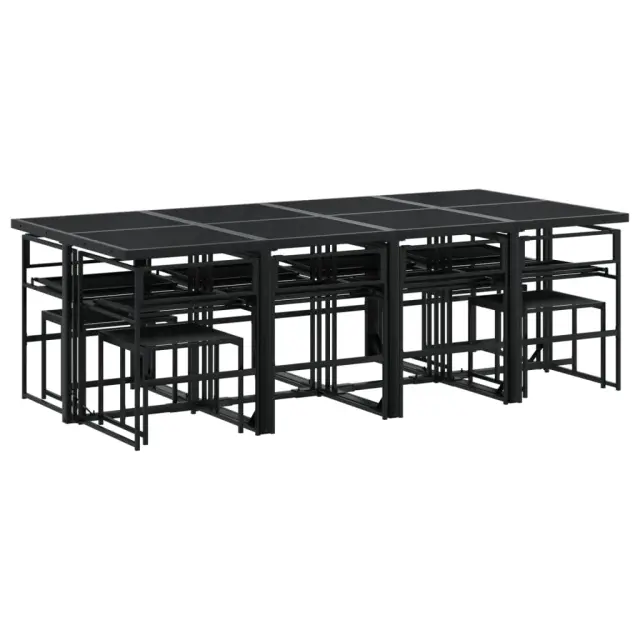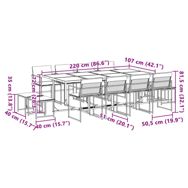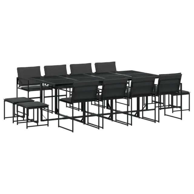 Ta vrtna jedilna garnitura je odlična izbira za večerjo na prostem ali za sprostitev na vrtu, dvorišču ali terasi. Trpežno in dolgotrajno: Zaradi svoje trajnosti, odpornosti na vodo in bledenje, enostavnega vzdrževanja ter zaščite pred UV žarki in plesnijo je tkanina iz tekstilena idealna izbira za zunanje pohištvo in konstrukcije za zagotavljanje sence.Kompaktno shranjevanje: Te stole je mogoče zložiti, zato jih je enostavno shraniti pod mizo. Ko so zloženi, se lepo prilegajo pod mizo in tvorijo prostorsko varčno kocko.Prevleko je mogoče odstraniti in oprati: Te sedežne blazine imajo odstranljive prevleke za lažje pranje in vzdrževanje.Steklena mizna plošča: Površina zunanje mize je izdelana iz močnega in trpežnega kaljenega stekla, kar omogoča enostavno čiščenje z vlažno krpo in vašemu zunanjemu prostoru doda pridih elegance.Robusten in stabilen okvir: Prašno barvan jekleni okvir zagotavlja, da je vrtno pohištvo močno in stabilno za vsakodnevno uporabo na prostem.Dobro je vedeti:Če želite, da vaše zunanje pohištvo ostane lepo, vam priporočamo, da ga zaščitite z vodoodporno prevleko.Maksimalna nosilnost (na sedež): 110 kgUV-odpornoPotrebno sestavljanje: DaMiza:Barva: ČrnaMaterial: Jeklo s prašnim premazom, kaljeno stekloDimenzije: 220 x 107 x 72 cm (D x Š x V)Stol:Barva: ČrnaMaterial: Tekstilen, jeklo s prašnim premazomDimenzije: 50,5 x 51 x 81,5 cm (Š x G x V)Velikost sedeža: 46 x 38 cm (Š x G)Višina sedeža od tal: 44 cmVišina naslonjal za roke, merjena od tal: 63,5 cmStolček:Barva: ČrnaMaterial: Tekstilen, jeklo s prašnim premazomDimenzije: 40 x 40 x 35 cm (Š x G x V)Blazina:Barva: Temno sivaMaterial prevleke: Tkanina (100 % poliester)Material polnila: PenaDimenzije blazine za sedež: 46,5 x 37 x 2 cm (Š x G x V)Dimenzije hrbtne blazine: 45,5 x 43,5 x 2,5 cm (D × Š × D)Dimenzije blazine za stolček: 40,5 x 40,5 x 2 cm (Š x G x D)Paket vsebuje:1 x Vrtna miza8 x Vrtni stol4 x Vrtni stolček8 x Sedežna blazina s snemljivo in pralno prevleko8 x Blazina za hrbet4 x Blazina za stolček s snemljivo in pralno prevleko 3295085