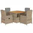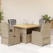 Ta vrtna jedilna garnitura je odlična izbira za večerjo na prostem ali za sprostitev na vrtu, dvorišču ali terasi. Vzdržljiv material: PE ratan, znan tudi kot poli ratan, je močan sintetični material, ki zahteva malo vzdrževanja in je videti kot naravni ratan. Je lahek, enostaven za čiščenje in se zaradi svoje vzdržljivosti in odpornosti na vremenske vplive pogosto uporablja za zunanje pohištvo.Nastavljivo naslonjalo: Ta vrtni sedež ima ročaj. S potegom ročaja lahko naslonjalo nastavite v poljuben položaj in ga hitro vrnete v prvotni položaj.Prevleko je mogoče odstraniti in oprati: Sedežna blazina ima odstranljivo prevleko za enostavno pranje in vzdrževanje.Nastavljiva mizna plošča: Z dvigom mizne plošče lahko mizo povišate, s čimer se zunanja klubska mizica spremeni v jedilno mizo. Popolna je za sprejemanje gostov ali uživanje v obrokih na prostem.Stabilna mizna plošča, ki je enostavna za čiščenje: Ta vrtna miza ima ploščo iz akacijevega lesa, ki je čvrsta, vzdržljiva in jo je enostavno čistiti z vlažno krpo. Dobro je vedeti:Če želite, da vaše zunanje pohištvo ostane lepo, vam priporočamo, da ga zaščitite z vodoodporno prevleko.Maksimalna nosilnost (na sedež): 110 kgUV-odpornoPotrebno sestavljanje: DaMiza:Barva: Bež in rjavaMaterial: PE ratan, prašno premazano jeklo, trden akacijev les z oljnim premazomDimenzije: 110 x 110 x 40/71 cm (D x Š x V)Vrtni naslanjač:Barva: BežMaterial: PE ratan, jeklen okvir s prašnim premazomDimenzije v sedečem položaju: 55 x 60 x 93 cm (Š x G x V)Dimenzije v ležečem položaju: 55 x 89 x 83 cm (Š x G x V)Velikost sedeža: 48 x 55 cm (Š x G)Višina sedeža, merjena od tal: 42 cmVišina naslonjala za roke, merjena od tal: 58 cmBlazina:Barva: Svetlo sivaMaterial prevleke: Tkanina (100 % poliester)Polnilo sedežne blazine: PenaPolnilo hrbtne blazine: bombažna vlaknaDimenzije sedežne blazine: 48 x 55 x 3 cm (Š x G x D)Dimenzije hrbtne blazine: 48 x 50 x 10 cm (D x Š x D)Paket vsebuje:1 x Vrtna miza4 x Vrtni stol s funkcijo nagiba4 x Blazina za hrbet4 x Sedežna blazina s snemljivo in pralno prevleko 3262773