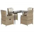 Ta vrtna jedilna garnitura je odlična izbira za večerjo na prostem ali za sprostitev na vrtu, dvorišču ali terasi. Vzdržljiv material: PE ratan, znan tudi kot poli ratan, je močan sintetični material, ki zahteva malo vzdrževanja in je videti kot naravni ratan. Je lahek, enostaven za čiščenje in se zaradi svoje vzdržljivosti in odpornosti na vremenske vplive pogosto uporablja za zunanje pohištvo.Nastavljivo naslonjalo: Ta vrtni sedež ima ročaj. S potegom ročaja lahko naslonjalo nastavite v poljuben položaj in ga hitro vrnete v prvotni položaj.Udobno sedenje: To zunanje pohištvo z debelo oblazinjenimi blazinami zagotavlja udobno sedenje.Prevleko je mogoče odstraniti in oprati: Sedežna blazina ima odstranljivo prevleko za enostavno pranje in vzdrževanje.Steklena mizna plošča: Površina zunanje mize je izdelana iz močnega in trpežnega kaljenega stekla, kar omogoča enostavno čiščenje z vlažno krpo in vašemu zunanjemu prostoru doda pridih elegance. Dobro je vedeti:Če želite, da vaše zunanje pohištvo ostane lepo, vam priporočamo, da ga zaščitite z vodoodporno prevleko.Maksimalna nosilnost (na sedež): 110 kgUV-odpornoPotrebno sestavljanje: DaMiza:Barva: ČrnaMaterial: Jeklo s prašnim premazom, kaljeno stekloDimenzije: 140 x 70 x 74 cm (D x Š x V)Vrtni naslanjač:Barva: BežMaterial: PE ratan, jeklen okvir s prašnim premazomDimenzije v sedečem položaju: 55 x 60 x 93 cm (Š x G x V)Dimenzije v ležečem položaju: 55 x 89 x 83 cm (Š x G x V)Velikost sedeža: 48 x 55 cm (Š x G)Višina sedeža, merjena od tal: 42 cmVišina naslonjala za roke, merjena od tal: 58 cmBlazina:Barva: Kremno belaMaterial prevleke: Tkanina (100 % poliester)Polnilo sedežne blazine: PenaPolnilo hrbtne blazine: bombažna vlaknaDimenzije sedežne blazine: 48 x 55 x 3 cm (Š x G x D)Dimenzije hrbtne blazine: 48 x 50 x 10 cm (D x Š x D)Paket vsebuje:1 x Vrtna miza4 x Vrtni stol s funkcijo nagiba4 x Blazina za hrbet4 x Sedežna blazina s snemljivo in pralno prevleko 3262884