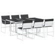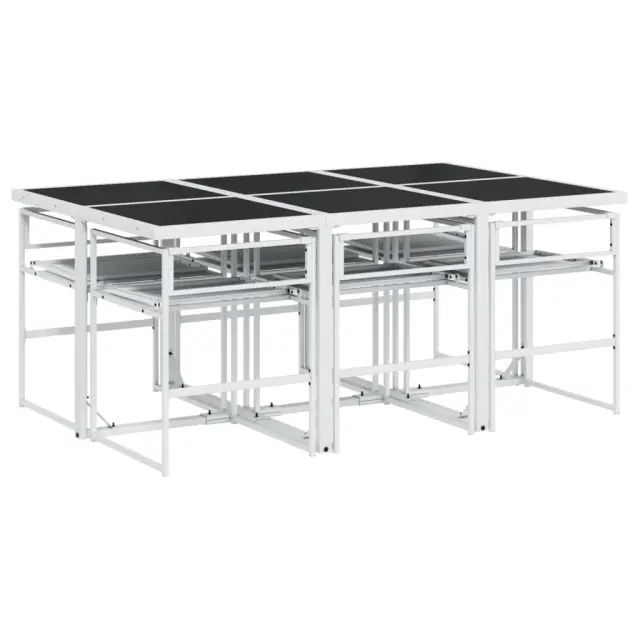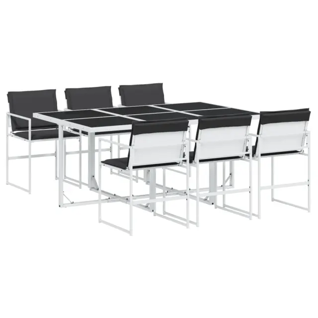 Ta vrtna jedilna garnitura je odlična izbira za večerjo na prostem ali za sprostitev na vrtu, dvorišču ali terasi. Trpežno in dolgotrajno: Zaradi svoje trajnosti, odpornosti na vodo in bledenje, enostavnega vzdrževanja ter zaščite pred UV žarki in plesnijo je tkanina iz tekstilena idealna izbira za zunanje pohištvo in konstrukcije za zagotavljanje sence.Kompaktno shranjevanje: Te stole je mogoče zložiti, zato jih je enostavno shraniti pod mizo. Ko so zloženi, se lepo prilegajo pod mizo in tvorijo prostorsko varčno kocko.Prevleko je mogoče odstraniti in oprati: Te sedežne blazine imajo odstranljive prevleke za lažje pranje in vzdrževanje.Steklena mizna plošča: Površina zunanje mize je izdelana iz močnega in trpežnega kaljenega stekla, kar omogoča enostavno čiščenje z vlažno krpo in vašemu zunanjemu prostoru doda pridih elegance.Robusten in stabilen okvir: Prašno barvan jekleni okvir zagotavlja, da je vrtno pohištvo močno in stabilno za vsakodnevno uporabo na prostem.Dobro je vedeti:Če želite, da vaše zunanje pohištvo ostane lepo, vam priporočamo, da ga zaščitite z vodoodporno prevleko.Maksimalna nosilnost (na sedež): 110 kgUV-odpornoPotrebno sestavljanje: DaMiza:Barva: BelaMaterial: Jeklo s prašnim premazom, kaljeno stekloDimenzije: 165 x 107 x 72 cm (D x Š x V)Stol:Barva: BelaMaterial: Tekstilen, jeklo s prašnim premazomDimenzije: 50,5 x 51 x 81,5 cm (Š x G x V)Velikost sedeža: 46 x 38 cm (Š x G)Višina sedeža od tal: 44 cmVišina naslonjal za roke, merjena od tal: 63,5 cmBlazina:Barva: AntracitnaMaterial prevleke: Tkanina (100 % poliester)Material polnila: PenaDimenzije blazine za sedež: 46,5 x 37 x 2 cm (Š x G x V)Dimenzije hrbtne blazine: 45,5 x 43,5 x 2,5 cm (D × Š × D)Paket vsebuje:1 x Vrtna miza6 x Vrtni stol6 x Sedežna blazina s snemljivo pralno prevleko6 x Blazina za hrbet 3295104