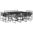 Ta vrtna jedilna garnitura je odlična izbira za večerjo na prostem ali za sprostitev na vrtu, dvorišču ali terasi. Vzdržljiv material: PE ratan, znan tudi kot poli ratan, je močan sintetični material, ki zahteva malo vzdrževanja in je videti kot naravni ratan. Je lahek, enostaven za čiščenje in se zaradi svoje vzdržljivosti in odpornosti na vremenske vplive pogosto uporablja za zunanje pohištvo.Kompaktno shranjevanje: Te vrtne stole je mogoče lepo pospraviti pod mizo in tako prihraniti prostor za shranjevanje.Prevleko je mogoče odstraniti in oprati: Te sedežne blazine imajo odstranljive prevleke za lažje pranje in vzdrževanje.Steklena mizna plošča: Površina zunanje mize je izdelana iz močnega in trpežnega kaljenega stekla, kar omogoča enostavno čiščenje z vlažno krpo in vašemu zunanjemu prostoru doda pridih elegance.Robusten in stabilen okvir: Prašno barvan jekleni okvir zagotavlja, da je vrtno pohištvo močno in stabilno za vsakodnevno uporabo na prostem.Dobro je vedeti:Če želite, da vaše zunanje pohištvo ostane lepo, vam priporočamo, da ga zaščitite z vodoodporno prevleko.Maksimalna nosilnost (na sedež): 110 kgUV-odpornoPotrebno sestavljanje: DaMiza:Barva: ČrnaMaterial: Jeklo s prašnim premazom, kaljeno stekloDimenzije: 165 x 107 x 72 cm (D x Š x V)Stol:Barva: ČrnaMaterial: PE ratan, jeklen okvir s prašnim premazomDimenzije: 50,5 x 51 x 81,5 cm (Š x G x V)Velikost sedeža: 46 x 38 cm (Š x G)Višina sedeža od tal: 44 cmVišina naslonjal za roke, merjena od tal: 63,5 cmBlazina:Barva: Kremno belaMaterial prevleke: Tkanina (100 % poliester)Material polnila: PenaDimenzije blazine za sedež: 46,5 x 37 x 2 cm (Š x G x V)Paket vsebuje:1 x Vrtna miza10 x Vrtni stol10 x Sedežna blazina s snemljivo in pralno prevleko 3295014