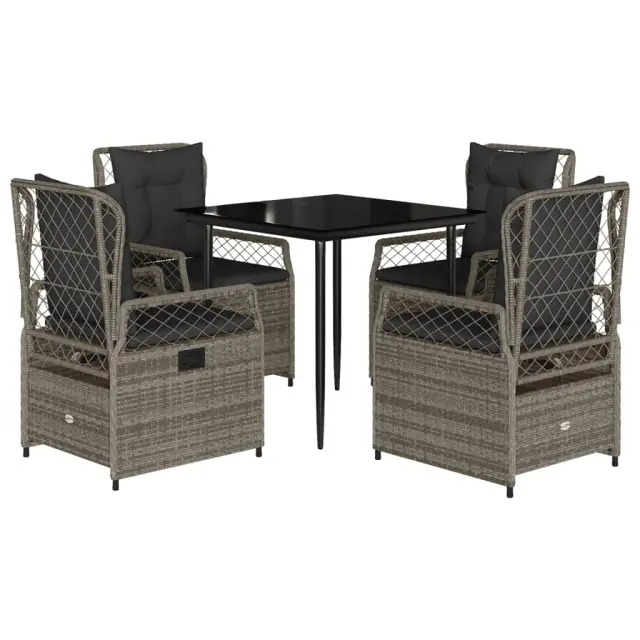 Ta vrtna jedilna garnitura je odlična izbira za večerjo na prostem ali za sprostitev na vrtu, dvorišču ali terasi. Vzdržljiv material: PE ratan, znan tudi kot poli ratan, je močan sintetični material, ki zahteva malo vzdrževanja in je videti kot naravni ratan. Je lahek, enostaven za čiščenje in se zaradi svoje vzdržljivosti in odpornosti na vremenske vplive pogosto uporablja za zunanje pohištvo.Nastavljivo naslonjalo: Ta vrtni sedež ima ročaj. S potegom ročaja lahko naslonjalo nastavite v poljuben položaj in ga hitro vrnete v prvotni položaj.Udobno sedenje: To zunanje pohištvo z debelo oblazinjenimi blazinami zagotavlja udobno sedenje.Prevleko je mogoče odstraniti in oprati: Sedežna blazina ima odstranljivo prevleko za enostavno pranje in vzdrževanje.Steklena mizna plošča: Površina zunanje mize je izdelana iz močnega in trpežnega kaljenega stekla, kar omogoča enostavno čiščenje z vlažno krpo in vašemu zunanjemu prostoru doda pridih elegance. Dobro je vedeti:Če želite, da vaše zunanje pohištvo ostane lepo, vam priporočamo, da ga zaščitite z vodoodporno prevleko.Maksimalna nosilnost (na sedež): 110 kgUV-odpornoPotrebno sestavljanje: DaMiza:Barva: ČrnaMaterial: Jeklo s prašnim premazom, kaljeno stekloDimenzije mize: 80 x 80 x 74 cm (D x Š x V)Vrtni naslanjač:Barva: SivaMaterial: PE ratan, jeklen okvir s prašnim premazomDimenzije v sedečem položaju: 55 x 60 x 93 cm (Š x G x V)Dimenzije v ležečem položaju: 55 x 89 x 83 cm (Š x G x V)Velikost sedeža: 48 x 55 cm (Š x G)Višina sedeža, merjena od tal: 42 cmVišina naslonjala za roke, merjena od tal: 58 cmBlazina:Barva: Temno sivaMaterial prevleke: Tkanina (100 % poliester)Polnilo sedežne blazine: PenaPolnilo hrbtne blazine: bombažna vlaknaDimenzije sedežne blazine: 48 x 55 x 3 cm (Š x G x D)Dimenzije hrbtne blazine: 48 x 50 x 10 cm (D x Š x D)Paket vsebuje:1 x Vrtna miza4 x Vrtni stol s funkcijo nagiba4 x Blazina za hrbet4 x Sedežna blazina s snemljivo in pralno prevleko 3262986