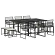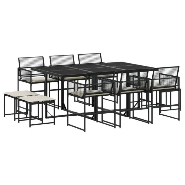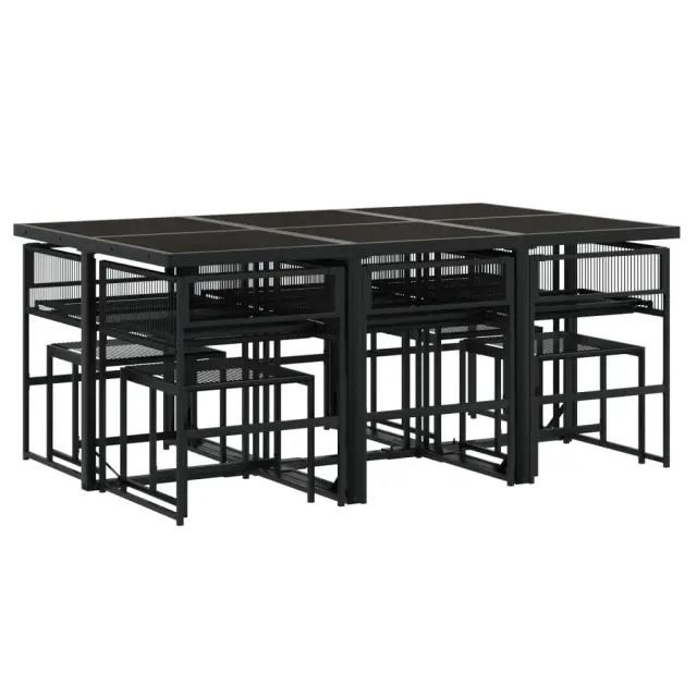 Ta vrtna jedilna garnitura je odlična izbira za večerjo na prostem ali za sprostitev na vrtu, dvorišču ali terasi. Vzdržljiv material: PE ratan, znan tudi kot poli ratan, je močan sintetični material, ki zahteva malo vzdrževanja in je videti kot naravni ratan. Je lahek, enostaven za čiščenje in se zaradi svoje vzdržljivosti in odpornosti na vremenske vplive pogosto uporablja za zunanje pohištvo. Steklena mizna plošča: Površina zunanje mize je izdelana iz močnega in trpežnega kaljenega stekla, kar omogoča enostavno čiščenje z vlažno krpo in vašemu zunanjemu prostoru doda pridih elegance. Kompaktno shranjevanje: Te stole je mogoče zložiti, zato jih je enostavno shraniti pod mizo. Ko so zloženi, se lepo prilegajo pod mizo in tvorijo prostorsko varčno kocko. Poleg tega je mogoče stolčke shraniti tudi pod stole, kar še poveča prostorsko učinkovitost. Udobno sedenje: To zunanje pohištvo z debelo oblazinjenimi blazinami zagotavlja udobno sedenje. Dobro je vedeti:Če želite, da vaše zunanje pohištvo ostane lepo, vam priporočamo, da ga zaščitite z vodoodporno prevleko.Maksimalna nosilnost (na sedež): 110 kgUV-odpornoPotrebno sestavljanje: DaMiza:Barva: ČrnaMaterial: PE ratan, jeklo s prašnim premazom, stekloDimenzije: 165 x 107 x 72 cm (D x Š x V)Stol:Barva: ČrnaMaterial: PE ratan, jeklen okvir s prašnim premazomDimenzije: 50,5 x 51 x 81,5 cm (Š x G x V)Velikost sedeža: 47 x 38 cm (Š x G)Višina sedeža od tal: 44 cmVišina naslonjala za roke od tal: 65 cmStolček:Barva: ČrnaMaterial: PE ratan, jeklen okvir s prašnim premazomDimenzije: 40 x 40 x 35 cm (Š x G x V)Blazina:Barva: Kremno belaMaterial prevleke: Tkanina (100 % poliester)Material polnila: PenaDimenzije sedežne blazine: 47 x 38 x 2 cm (Š x G x D)Dimenzije blazine za stolček: 40,5 x 40,5 x 2 cm (Š x G x D)Paket vsebuje:1 x Vrtna miza6 x Vrtni stol4 x Vrtni stolček6 x Blazina za sedež4 x Blazina za stolček 3295029