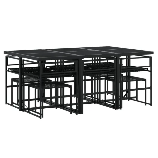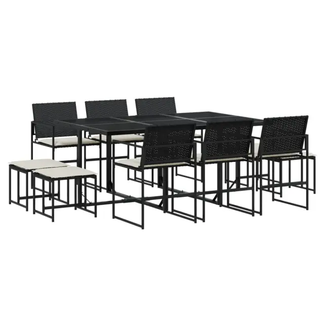 Ta vrtna jedilna garnitura je odlična izbira za večerjo na prostem ali za sprostitev na vrtu, dvorišču ali terasi. Vzdržljiv material: PE ratan, znan tudi kot poli ratan, je močan sintetični material, ki zahteva malo vzdrževanja in je videti kot naravni ratan. Je lahek, enostaven za čiščenje in se zaradi svoje vzdržljivosti in odpornosti na vremenske vplive pogosto uporablja za zunanje pohištvo.Kompaktno shranjevanje: Te stole je mogoče zložiti, zato jih je enostavno shraniti pod mizo. Ko so zloženi, se lepo prilegajo pod mizo in tvorijo prostorsko varčno kocko.Prevleko je mogoče odstraniti in oprati: Te sedežne blazine imajo odstranljive prevleke za lažje pranje in vzdrževanje.Steklena mizna plošča: Površina zunanje mize je izdelana iz močnega in trpežnega kaljenega stekla, kar omogoča enostavno čiščenje z vlažno krpo in vašemu zunanjemu prostoru doda pridih elegance.Robusten in stabilen okvir: Prašno barvan jekleni okvir zagotavlja, da je vrtno pohištvo močno in stabilno za vsakodnevno uporabo na prostem.Dobro je vedeti:Če želite, da vaše zunanje pohištvo ostane lepo, vam priporočamo, da ga zaščitite z vodoodporno prevleko.Maksimalna nosilnost (na sedež): 110 kgUV-odpornoPotrebno sestavljanje: DaMiza:Barva: ČrnaMaterial: Jeklo s prašnim premazom, kaljeno stekloDimenzije: 165 x 107 x 72 cm (D x Š x V)Stol:Barva: ČrnaMaterial: PE ratan, jeklen okvir s prašnim premazomDimenzije: 50,5 x 51 x 81,5 cm (Š x G x V)Velikost sedeža: 46 x 38 cm (Š x G)Višina sedeža od tal: 44 cmVišina naslonjal za roke, merjena od tal: 63,5 cmStolček:Barva: ČrnaMaterial: PE ratan, jeklen okvir s prašnim premazomDimenzije: 40 x 40 x 35 cm (Š x G x V)Blazina:Barva: Kremno belaMaterial prevleke: Tkanina (100 % poliester)Material polnila: PenaDimenzije blazine za sedež: 46,5 x 37 x 2 cm (Š x G x V)Dimenzije blazine za stolček: 40,5 x 40,5 x 2 cm (Š x G x D)Paket vsebuje:1 x Vrtna miza6 x Vrtni stol4 x Vrtni stolček6 x Sedežna blazina s snemljivo pralno prevleko4 x Blazina za stolček s snemljivo in pralno prevleko 3295069