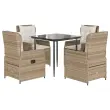 Ta vrtna jedilna garnitura je odlična izbira za večerjo na prostem ali za sprostitev na vrtu, dvorišču ali terasi. Vzdržljiv material: PE ratan, znan tudi kot poli ratan, je močan sintetični material, ki zahteva malo vzdrževanja in je videti kot naravni ratan. Je lahek, enostaven za čiščenje in se zaradi svoje vzdržljivosti in odpornosti na vremenske vplive pogosto uporablja za zunanje pohištvo.Nastavljivo naslonjalo: Ta vrtni sedež ima ročaj. S potegom ročaja lahko naslonjalo nastavite v poljuben položaj in ga hitro vrnete v prvotni položaj.Udobno sedenje: To zunanje pohištvo z debelo oblazinjenimi blazinami zagotavlja udobno sedenje.Prevleko je mogoče odstraniti in oprati: Sedežna blazina ima odstranljivo prevleko za enostavno pranje in vzdrževanje.Steklena mizna plošča: Površina zunanje mize je izdelana iz močnega in trpežnega kaljenega stekla, kar omogoča enostavno čiščenje z vlažno krpo in vašemu zunanjemu prostoru doda pridih elegance. Dobro je vedeti:Če želite, da vaše zunanje pohištvo ostane lepo, vam priporočamo, da ga zaščitite z vodoodporno prevleko.Maksimalna nosilnost (na sedež): 110 kgUV-odpornoPotrebno sestavljanje: DaMiza:Barva: ČrnaMaterial: Jeklo s prašnim premazom, kaljeno stekloDimenzije mize: 80 x 80 x 74 cm (D x Š x V)Vrtni naslanjač:Barva: BežMaterial: PE ratan, jeklen okvir s prašnim premazomDimenzije v sedečem položaju: 55 x 60 x 93 cm (Š x G x V)Dimenzije v ležečem položaju: 55 x 89 x 83 cm (Š x G x V)Velikost sedeža: 48 x 55 cm (Š x G)Višina sedeža, merjena od tal: 42 cmVišina naslonjala za roke, merjena od tal: 58 cmBlazina:Barva: Kremno belaMaterial prevleke: Tkanina (100 % poliester)Polnilo sedežne blazine: PenaPolnilo hrbtne blazine: bombažna vlaknaDimenzije sedežne blazine: 48 x 55 x 3 cm (Š x G x D)Dimenzije hrbtne blazine: 48 x 50 x 10 cm (D x Š x D)Paket vsebuje:1 x Vrtna miza4 x Vrtni stol s funkcijo nagiba4 x Blazina za hrbet4 x Sedežna blazina s snemljivo in pralno prevleko 3262883