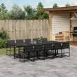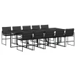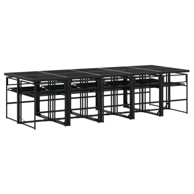 Ta vrtna jedilna garnitura je odlična izbira za večerjo na prostem ali za sprostitev na vrtu, dvorišču ali terasi. Trpežno in dolgotrajno: Zaradi svoje trajnosti, odpornosti na vodo in bledenje, enostavnega vzdrževanja ter zaščite pred UV žarki in plesnijo je tkanina iz tekstilena idealna izbira za zunanje pohištvo in konstrukcije za zagotavljanje sence.Kompaktno shranjevanje: Te stole je mogoče zložiti, zato jih je enostavno shraniti pod mizo. Ko so zloženi, se lepo prilegajo pod mizo in tvorijo prostorsko varčno kocko.Prevleko je mogoče odstraniti in oprati: Te sedežne blazine imajo odstranljive prevleke za lažje pranje in vzdrževanje.Steklena mizna plošča: Površina zunanje mize je izdelana iz močnega in trpežnega kaljenega stekla, kar omogoča enostavno čiščenje z vlažno krpo in vašemu zunanjemu prostoru doda pridih elegance.Robusten in stabilen okvir: Prašno barvan jekleni okvir zagotavlja, da je vrtno pohištvo močno in stabilno za vsakodnevno uporabo na prostem.Dobro je vedeti:Če želite, da vaše zunanje pohištvo ostane lepo, vam priporočamo, da ga zaščitite z vodoodporno prevleko.Maksimalna nosilnost (na sedež): 110 kgUV-odpornoPotrebno sestavljanje: DaMiza:Barva: ČrnaMaterial: Jeklo s prašnim premazom, kaljeno stekloDimenzije: 275 x 107 x 72 cm (D x Š x V)Stol:Barva: ČrnaMaterial: Tekstilen, jeklo s prašnim premazomDimenzije: 50,5 x 51 x 81,5 cm (Š x G x V)Velikost sedeža: 46 x 38 cm (Š x G)Višina sedeža od tal: 44 cmVišina naslonjal za roke, merjena od tal: 63,5 cmBlazina:Barva: Temno sivaMaterial prevleke: Tkanina (100 % poliester)Material polnila: PenaDimenzije blazine za sedež: 46,5 x 37 x 2 cm (Š x G x V)Dimenzije hrbtne blazine: 45,5 x 43,5 x 2,5 cm (D × Š × D)Paket vsebuje:1 x Vrtna miza10 x Vrtni stol10 x Sedežna blazina s snemljivo in pralno prevleko10 x Blazina za hrbet 3295076