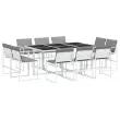 Ta vrtna jedilna garnitura je odlična izbira za večerjo na prostem ali za sprostitev na vrtu, dvorišču ali terasi. Trpežno in dolgotrajno: Zaradi svoje trajnosti, odpornosti na vodo in bledenje, enostavnega vzdrževanja ter zaščite pred UV žarki in plesnijo je tkanina iz tekstilena idealna izbira za zunanje pohištvo in konstrukcije za zagotavljanje sence.Kompaktno shranjevanje: Te stole je mogoče zložiti, zato jih je enostavno shraniti pod mizo. Ko so zloženi, se lepo prilegajo pod mizo in tvorijo prostorsko varčno kocko.Prevleko je mogoče odstraniti in oprati: Te sedežne blazine imajo odstranljive prevleke za lažje pranje in vzdrževanje.Steklena mizna plošča: Površina zunanje mize je izdelana iz močnega in trpežnega kaljenega stekla, kar omogoča enostavno čiščenje z vlažno krpo in vašemu zunanjemu prostoru doda pridih elegance.Robusten in stabilen okvir: Prašno barvan jekleni okvir zagotavlja, da je vrtno pohištvo močno in stabilno za vsakodnevno uporabo na prostem.Dobro je vedeti:Če želite, da vaše zunanje pohištvo ostane lepo, vam priporočamo, da ga zaščitite z vodoodporno prevleko.Maksimalna nosilnost (na sedež): 110 kgUV-odpornoPotrebno sestavljanje: DaMiza:Barva: BelaMaterial: Jeklo s prašnim premazom, kaljeno stekloDimenzije: 165 x 107 x 72 cm (D x Š x V)Stol:Barva: BelaMaterial: Tekstilen, jeklo s prašnim premazomDimenzije: 50,5 x 51 x 81,5 cm (Š x G x V)Velikost sedeža: 46 x 38 cm (Š x G)Višina sedeža od tal: 44 cmVišina naslonjal za roke, merjena od tal: 63,5 cmBlazina:Barva: Svetlo sivaMaterial prevleke: Tkanina (100 % poliester)Material polnila: PenaDimenzije blazine za sedež: 46,5 x 37 x 2 cm (Š x G x V)Dimenzije hrbtne blazine: 45,5 x 43,5 x 2,5 cm (D × Š × D)Paket vsebuje:1 x Vrtna miza10 x Vrtni stol10 x Sedežna blazina s snemljivo in pralno prevleko10 x Blazina za hrbet 3295094