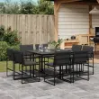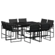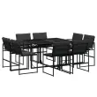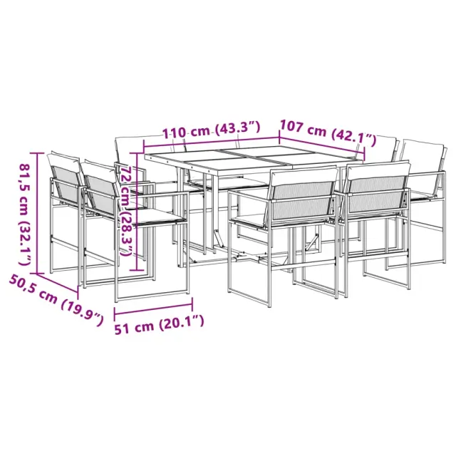 Ta vrtna jedilna garnitura je odlična izbira za večerjo na prostem ali za sprostitev na vrtu, dvorišču ali terasi. Trpežno in dolgotrajno: Zaradi svoje trajnosti, odpornosti na vodo in bledenje, enostavnega vzdrževanja ter zaščite pred UV žarki in plesnijo je tkanina iz tekstilena idealna izbira za zunanje pohištvo in konstrukcije za zagotavljanje sence.Kompaktno shranjevanje: Te stole je mogoče zložiti, zato jih je enostavno shraniti pod mizo. Ko so zloženi, se lepo prilegajo pod mizo in tvorijo prostorsko varčno kocko.Prevleko je mogoče odstraniti in oprati: Te sedežne blazine imajo odstranljive prevleke za lažje pranje in vzdrževanje.Steklena mizna plošča: Površina zunanje mize je izdelana iz močnega in trpežnega kaljenega stekla, kar omogoča enostavno čiščenje z vlažno krpo in vašemu zunanjemu prostoru doda pridih elegance.Robusten in stabilen okvir: Prašno barvan jekleni okvir zagotavlja, da je vrtno pohištvo močno in stabilno za vsakodnevno uporabo na prostem.Dobro je vedeti:Če želite, da vaše zunanje pohištvo ostane lepo, vam priporočamo, da ga zaščitite z vodoodporno prevleko.Maksimalna nosilnost (na sedež): 110 kgUV-odpornoPotrebno sestavljanje: DaMiza:Barva: ČrnaMaterial: Jeklo s prašnim premazom, kaljeno stekloDimenzije: 110 x 107 x 72 cm (D x Š x V)Stol:Barva: ČrnaMaterial: Tekstilen, jeklo s prašnim premazomDimenzije: 50,5 x 51 x 81,5 cm (Š x G x V)Velikost sedeža: 46 x 38 cm (Š x G)Višina sedeža od tal: 44 cmVišina naslonjal za roke, merjena od tal: 63,5 cmBlazina:Barva: Temno sivaMaterial prevleke: Tkanina (100 % poliester)Material polnila: PenaDimenzije blazine za sedež: 46,5 x 37 x 2 cm (Š x G x V)Dimenzije hrbtne blazine: 45,5 x 43,5 x 2,5 cm (D × Š × D)Paket vsebuje:1 x Vrtna miza8 x Vrtni stol8 x Sedežna blazina s snemljivo in pralno prevleko8 x Blazina za hrbet 3295078