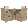 Ta vrtna jedilna garnitura je odlična izbira za večerjo na prostem ali za sprostitev na vrtu, dvorišču ali terasi. Vzdržljiv material: PE ratan, znan tudi kot poli ratan, je močan sintetični material, ki zahteva malo vzdrževanja in je videti kot naravni ratan. Je lahek, enostaven za čiščenje in se zaradi svoje vzdržljivosti in odpornosti na vremenske vplive pogosto uporablja za zunanje pohištvo.Nastavljivo naslonjalo: Ta vrtni sedež ima ročaj. S potegom ročaja lahko naslonjalo nastavite v poljuben položaj in ga hitro vrnete v prvotni položaj.Prevleko je mogoče odstraniti in oprati: Sedežna blazina ima odstranljivo prevleko za enostavno pranje in vzdrževanje.Nastavljiva mizna plošča: Z dvigom mizne plošče lahko mizo povišate, s čimer se zunanja klubska mizica spremeni v jedilno mizo. Popolna je za sprejemanje gostov ali uživanje v obrokih na prostem.Stabilna mizna plošča, ki je enostavna za čiščenje: Ta vrtna miza ima ploščo iz akacijevega lesa, ki je čvrsta, vzdržljiva in jo je enostavno čistiti z vlažno krpo. Dobro je vedeti:Če želite, da vaše zunanje pohištvo ostane lepo, vam priporočamo, da ga zaščitite z vodoodporno prevleko.Maksimalna nosilnost (na sedež): 110 kgUV-odpornoPotrebno sestavljanje: DaMiza:Barva: Bež in rjavaMaterial: PE ratan, prašno premazano jeklo, trden akacijev les z oljnim premazomDimenzije: 80 x 80 x 40/71 cm (D x Š x V)Vrtni naslanjač:Barva: BežMaterial: PE ratan, jeklen okvir s prašnim premazomDimenzije v sedečem položaju: 55 x 60 x 93 cm (Š x G x V)Dimenzije v ležečem položaju: 55 x 89 x 83 cm (Š x G x V)Velikost sedeža: 48 x 55 cm (Š x G)Višina sedeža, merjena od tal: 42 cmVišina naslonjala za roke, merjena od tal: 58 cmBlazina:Barva: Kremno belaMaterial prevleke: Tkanina (100 % poliester)Polnilo sedežne blazine: PenaPolnilo hrbtne blazine: bombažna vlaknaDimenzije sedežne blazine: 48 x 55 x 3 cm (Š x G x D)Dimenzije hrbtne blazine: 48 x 50 x 10 cm (D x Š x D)Paket vsebuje:1 x Vrtna miza4 x Vrtni stol s funkcijo nagiba4 x Blazina za hrbet4 x Sedežna blazina s snemljivo in pralno prevleko 3262775