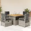 Ta vrtna jedilna garnitura je odlična izbira za večerjo na prostem ali za sprostitev na vrtu, dvorišču ali terasi. Vzdržljiv material: PE ratan, znan tudi kot poli ratan, je močan sintetični material, ki zahteva malo vzdrževanja in je videti kot naravni ratan. Je lahek, enostaven za čiščenje in se zaradi svoje vzdržljivosti in odpornosti na vremenske vplive pogosto uporablja za zunanje pohištvo.Nastavljivo naslonjalo: Ta vrtni sedež ima ročaj. S potegom ročaja lahko naslonjalo nastavite v poljuben položaj in ga hitro vrnete v prvotni položaj.Prevleko je mogoče odstraniti in oprati: Sedežna blazina ima odstranljivo prevleko za enostavno pranje in vzdrževanje.Nastavljiva mizna plošča: Z dvigom mizne plošče lahko mizo povišate, s čimer se zunanja klubska mizica spremeni v jedilno mizo. Popolna je za sprejemanje gostov ali uživanje v obrokih na prostem.Stabilna mizna plošča, ki je enostavna za čiščenje: Ta vrtna miza ima ploščo iz akacijevega lesa, ki je čvrsta, vzdržljiva in jo je enostavno čistiti z vlažno krpo. Dobro je vedeti:Če želite, da vaše zunanje pohištvo ostane lepo, vam priporočamo, da ga zaščitite z vodoodporno prevleko.Maksimalna nosilnost (na sedež): 110 kgUV-odpornoPotrebno sestavljanje: DaMiza:Barva: Siva in rjavaMaterial: PE ratan, prašno premazano jeklo, trden akacijev les z oljnim premazomDimenzije: 110 x 110 x 40/71 cm (D x Š x V)Vrtni naslanjač:Barva: SivaMaterial: PE ratan, jeklen okvir s prašnim premazomDimenzije v sedečem položaju: 55 x 60 x 93 cm (Š x G x V)Dimenzije v ležečem položaju: 55 x 89 x 83 cm (Š x G x V)Velikost sedeža: 48 x 55 cm (Š x G)Višina sedeža, merjena od tal: 42 cmVišina naslonjala za roke, merjena od tal: 58 cmBlazina:Barva: Temno sivaMaterial prevleke: Tkanina (100 % poliester)Polnilo sedežne blazine: PenaPolnilo hrbtne blazine: bombažna vlaknaDimenzije sedežne blazine: 48 x 55 x 3 cm (Š x G x D)Dimenzije hrbtne blazine: 48 x 50 x 10 cm (D x Š x D)Paket vsebuje:1 x Vrtna miza4 x Vrtni stol s funkcijo nagiba4 x Blazina za hrbet4 x Sedežna blazina s snemljivo in pralno prevleko 3262915