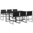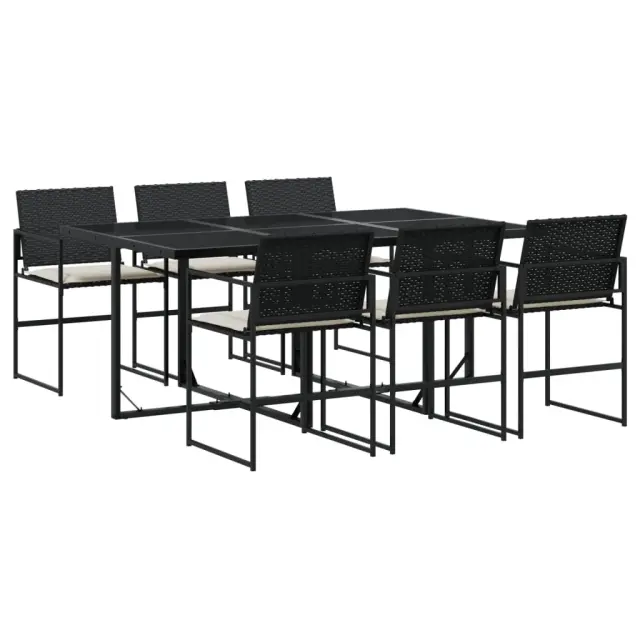 Ta vrtna jedilna garnitura je odlična izbira za večerjo na prostem ali za sprostitev na vrtu, dvorišču ali terasi. Vzdržljiv material: PE ratan, znan tudi kot poli ratan, je močan sintetični material, ki zahteva malo vzdrževanja in je videti kot naravni ratan. Je lahek, enostaven za čiščenje in se zaradi svoje vzdržljivosti in odpornosti na vremenske vplive pogosto uporablja za zunanje pohištvo.Kompaktno shranjevanje: Te stole je mogoče zložiti, zato jih je enostavno shraniti pod mizo. Ko so zloženi, se lepo prilegajo pod mizo in tvorijo prostorsko varčno kocko.Prevleko je mogoče odstraniti in oprati: Te sedežne blazine imajo odstranljive prevleke za lažje pranje in vzdrževanje.Steklena mizna plošča: Površina zunanje mize je izdelana iz močnega in trpežnega kaljenega stekla, kar omogoča enostavno čiščenje z vlažno krpo in vašemu zunanjemu prostoru doda pridih elegance.Robusten in stabilen okvir: Prašno barvan jekleni okvir zagotavlja, da je vrtno pohištvo močno in stabilno za vsakodnevno uporabo na prostem.Dobro je vedeti:Če želite, da vaše zunanje pohištvo ostane lepo, vam priporočamo, da ga zaščitite z vodoodporno prevleko.Maksimalna nosilnost (na sedež): 110 kgUV-odpornoPotrebno sestavljanje: DaMiza:Barva: ČrnaMaterial: Jeklo s prašnim premazom, kaljeno stekloDimenzije: 165 x 107 x 72 cm (D x Š x V)Stol:Barva: ČrnaMaterial: PE ratan, jeklen okvir s prašnim premazomDimenzije: 50,5 x 51 x 81,5 cm (Š x G x V)Velikost sedeža: 46 x 38 cm (Š x G)Višina sedeža od tal: 44 cmVišina naslonjal za roke, merjena od tal: 63,5 cmBlazina:Barva: Kremno belaMaterial prevleke: Tkanina (100 % poliester)Material polnila: PenaDimenzije blazine za sedež: 46,5 x 37 x 2 cm (Š x G x V)Paket vsebuje:1 x Vrtna miza6 x Vrtni stol6 x Sedežna blazina s snemljivo pralno prevleko 3295059