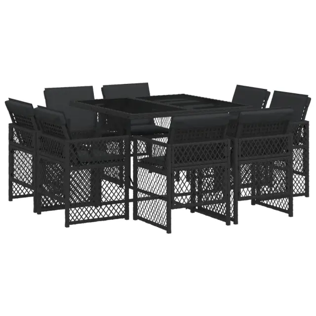 vidaXL Vrtna jedilna garnitura 9-delna z blazinami črn poli ratan