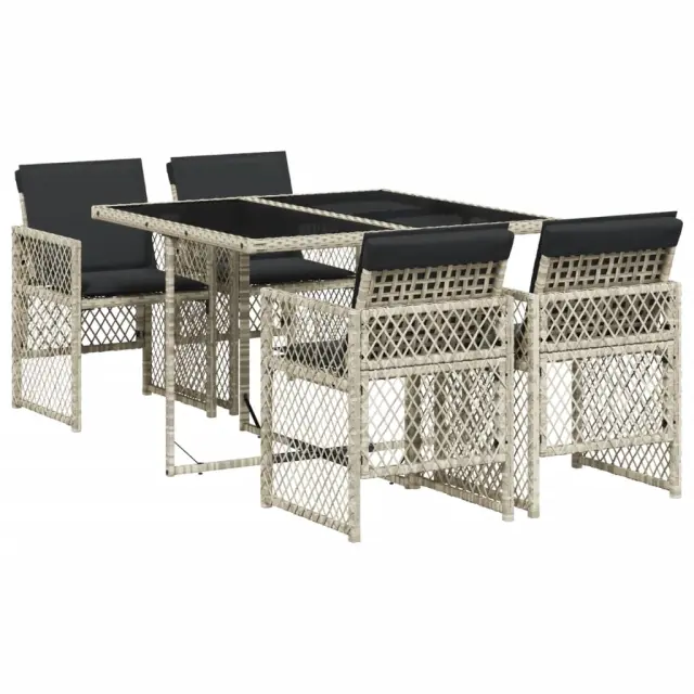 Ta vrtna jedilna garnitura je odlična izbira za večerjo na prostem ali za sprostitev na vrtu, dvorišču ali terasi. Vzdržljiv material: PE ratan, znan tudi kot poli ratan, je močan sintetični material, ki zahteva malo vzdrževanja in je videti kot naravni ratan. Je lahek, enostaven za čiščenje in se zaradi svoje vzdržljivosti in odpornosti na vremenske vplive pogosto uporablja za zunanje pohištvo. Steklena mizna plošča: Površina zunanje mize je izdelana iz močnega in trpežnega kaljenega stekla, kar omogoča enostavno čiščenje z vlažno krpo in vašemu zunanjemu prostoru doda pridih elegance. Kompaktno shranjevanje: Te stole je mogoče zložiti, zato jih je enostavno shraniti pod mizo. Ko so zloženi, se lepo prilegajo pod mizo in tvorijo prostorsko varčno kocko. Udobno sedenje: To zunanje pohištvo z debelo oblazinjenimi blazinami zagotavlja udobno sedenje. Prevleko je mogoče odstraniti in oprati: Te sedežne blazine imajo odstranljive prevleke za lažje pranje in vzdrževanje. Prevleke za blazine za stole imajo na zadnji strani zavihek za enostavno pritrditev na stole. Dobro je vedeti:Če želite, da vaše zunanje pohištvo ostane lepo, vam priporočamo, da ga zaščitite z vodoodporno prevleko.Maksimalna nosilnost (na sedež): 110 kgUV-odpornoPotrebno sestavljanje: DaMiza:Barva: Svetlo sivaMaterial: PE ratan, jeklo s prašnim premazom, kaljeno stekloDimenzije: 110 x 106 x 73 cm (D x Š x V)Stol:Barva: Svetlo sivaMaterial: PE ratan, jeklen okvir s prašnim premazomDimenzije vrtnega stola: 50,5 x 54 x 79 cm (Š x G x V)Velikost sedeža: 45 x 38 cm (Š x G)Višina sedišča, merjena od tal: 43 cmVišina naslonjala za roke, merjena od tal: 64 cmBlazina:Barva: AntracitnaMaterial prevleke: Tkanina (100 % poliester)Material polnila: PenaDimenzije blazine za stol: 76 x 46 x 2 cm (D x Š x D)Dimenzije blazine za stolček: 40 x 40 x 2 cm (Š x G x D)Paket vsebuje:1 x Vrtna miza4 x Vrtni stol4 x Blazina za stol z visokim naslonom s snemljivo in pralno prevleko 3210719