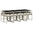 Ta vrtna jedilna garnitura je odlična izbira za večerjo na prostem ali za sprostitev na vrtu, dvorišču ali terasi. Vzdržljiv material: PE ratan, znan tudi kot poli ratan, je močan sintetični material, ki zahteva malo vzdrževanja in je videti kot naravni ratan. Je lahek, enostaven za čiščenje in se zaradi svoje vzdržljivosti in odpornosti na vremenske vplive pogosto uporablja za zunanje pohištvo.Kompaktno shranjevanje: Te stole je mogoče zložiti, zato jih je enostavno shraniti pod mizo. Ko so zloženi, se lepo prilegajo pod mizo in tvorijo prostorsko varčno kocko.Udobno sedenje: To zunanje pohištvo z debelo oblazinjenimi blazinami zagotavlja udobno sedenje.Prevleko je mogoče odstraniti in oprati: Te sedežne blazine imajo odstranljive prevleke za lažje pranje in vzdrževanje. Prevleke za blazine imajo na zadnji strani zavihek za enostavno pritrditev na naslonjala.Steklena mizna plošča: Površina zunanje mize je izdelana iz močnega in trpežnega kaljenega stekla, kar omogoča enostavno čiščenje z vlažno krpo in vašemu zunanjemu prostoru doda pridih elegance. Dobro je vedeti:Če želite, da vaše zunanje pohištvo ostane lepo, vam priporočamo, da ga zaščitite z vodoodporno prevleko.Maksimalna nosilnost (na sedež): 110 kgUV-odpornoPotrebno sestavljanje: DaMiza:Barva mize: Svetlo sivaBarva stekla: ČrnaMaterial: PE ratan, jeklo s prašnim premazom, kaljeno stekloDimenzije: 220 x 106 x 73 cm (D x Š x V)Stol:Barva: Svetlo sivaMaterial: PE ratan, jeklen okvir s prašnim premazomDimenzije: 50,5 x 50 x 79 cm (Š x G x V)Velikost sedišča: 45,5 x 38 cm (Š x G)Višina sedišča, merjena od tal: 43 cmVišina naslonjal za roke, merjena od tal: 63,5 cmBlazina:Barva: AntracitnaMaterial prevleke: Tkanina (100 % poliester)Material polnila: PenaDimenzije blazine za stol: 76 x 45,5 x 2 cm (D x Š x D)Paket vsebuje:1 x Vrtna miza8 x Vrtni stol8 x Blazina za stol z visokim naslonom s snemljivo in pralno prevleko 3278050