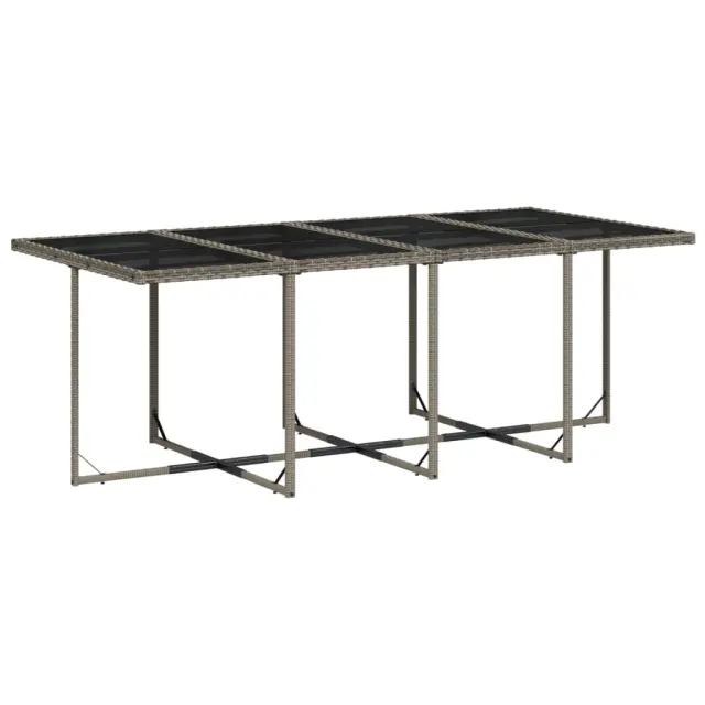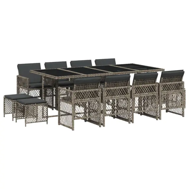 Ta vrtna jedilna garnitura je odlična izbira za večerjo na prostem ali za sprostitev na vrtu, dvorišču ali terasi. Vzdržljiv material: PE ratan, znan tudi kot poli ratan, je močan sintetični material, ki zahteva malo vzdrževanja in je videti kot naravni ratan. Je lahek, enostaven za čiščenje in se zaradi svoje vzdržljivosti in odpornosti na vremenske vplive pogosto uporablja za zunanje pohištvo. Steklena mizna plošča: Površina zunanje mize je izdelana iz močnega in trpežnega kaljenega stekla, kar omogoča enostavno čiščenje z vlažno krpo in vašemu zunanjemu prostoru doda pridih elegance. Kompaktno shranjevanje: Te stole je mogoče zložiti, zato jih je enostavno shraniti pod mizo. Ko so zloženi, se lepo prilegajo pod mizo in tvorijo prostorsko varčno kocko. Poleg tega je mogoče stolčke shraniti tudi pod stole, kar še poveča prostorsko učinkovitost. Udobno sedenje: To zunanje pohištvo z debelo oblazinjenimi blazinami zagotavlja udobno sedenje. Prevleko je mogoče odstraniti in oprati: Te sedežne blazine imajo odstranljive prevleke za lažje pranje in vzdrževanje. Prevleke za blazine za stole imajo na zadnji strani zavihek za enostavno pritrditev na stole. Dobro je vedeti:Če želite, da vaše zunanje pohištvo ostane lepo, vam priporočamo, da ga zaščitite z vodoodporno prevleko.Maksimalna nosilnost (na sedež): 110 kgUV-odpornoPotrebno sestavljanje: DaMiza:Barva: SivaMaterial: PE ratan, jeklo s prašnim premazom, kaljeno stekloDimenzije: 220 x 106 x 73 cm (D x Š x V)Stol:Barva: SivaMaterial: PE ratan, jeklen okvir s prašnim premazomDimenzije vrtnega stola: 50,5 x 54 x 79 cm (Š x G x V)Velikost sedeža: 45 x 38 cm (Š x G)Višina sedišča, merjena od tal: 43 cmVišina naslonjala za roke, merjena od tal: 64 cmDimenzije vrtnega stola: 41 x 41 x 36 cm (Š x G x V)Blazina:Barva: Temno sivaMaterial prevleke: Tkanina (100 % poliester)Material polnila: PenaDimenzije blazine za stol: 76 x 46 x 2 cm (D x Š x D)Dimenzije blazine za stolček: 40 x 40 x 2 cm (Š x G x D)Paket vsebuje:1 x Vrtna miza8 x Vrtni stol4 x Vrtni stolček8 x Blazina za stol z visokim naslonom s snemljivo in pralno prevleko4 x Blazina za stolček s snemljivo in pralno prevleko 3210800