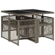 Ta vrtna jedilna garnitura je odlična izbira za večerjo na prostem ali za sprostitev na vrtu, dvorišču ali terasi. Vzdržljiv material: PE ratan, znan tudi kot poli ratan, je močan sintetični material, ki zahteva malo vzdrževanja in je videti kot naravni ratan. Je lahek, enostaven za čiščenje in se zaradi svoje vzdržljivosti in odpornosti na vremenske vplive pogosto uporablja za zunanje pohištvo. Steklena mizna plošča: Površina zunanje mize je izdelana iz močnega in trpežnega kaljenega stekla, kar omogoča enostavno čiščenje z vlažno krpo in vašemu zunanjemu prostoru doda pridih elegance. Kompaktno shranjevanje: Te stole je mogoče zložiti, zato jih je enostavno shraniti pod mizo. Ko so zloženi, se lepo prilegajo pod mizo in tvorijo prostorsko varčno kocko. Udobno sedenje: To zunanje pohištvo z debelo oblazinjenimi blazinami zagotavlja udobno sedenje. Prevleko je mogoče odstraniti in oprati: Te sedežne blazine imajo odstranljive prevleke za lažje pranje in vzdrževanje. Prevleke za blazine za stole imajo na zadnji strani zavihek za enostavno pritrditev na stole. Dobro je vedeti:Če želite, da vaše zunanje pohištvo ostane lepo, vam priporočamo, da ga zaščitite z vodoodporno prevleko.Maksimalna nosilnost (na sedež): 110 kgUV-odpornoPotrebno sestavljanje: DaMiza:Barva: SivaMaterial: PE ratan, jeklo s prašnim premazom, kaljeno stekloDimenzije: 110 x 106 x 73 cm (D x Š x V)Stol:Barva: SivaMaterial: PE ratan, jeklen okvir s prašnim premazomDimenzije vrtnega stola: 50,5 x 54 x 79 cm (Š x G x V)Velikost sedeža: 45 x 38 cm (Š x G)Višina sedišča, merjena od tal: 43 cmVišina naslonjala za roke, merjena od tal: 64 cmBlazina:Barva: Temno sivaMaterial prevleke: Tkanina (100 % poliester)Material polnila: PenaDimenzije blazine za stol: 76 x 46 x 2 cm (D x Š x D)Dimenzije blazine za stolček: 40 x 40 x 2 cm (Š x G x D)Paket vsebuje:1 x Vrtna miza4 x Vrtni stol4 x Blazina za stol z visokim naslonom s snemljivo in pralno prevleko 3210716