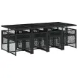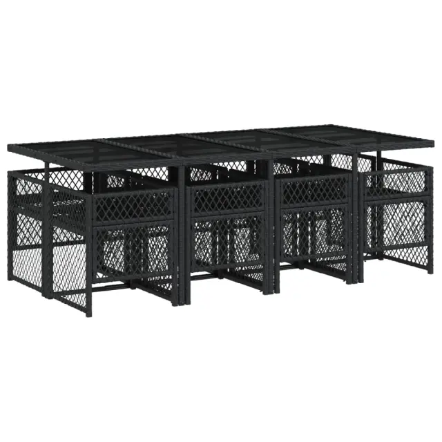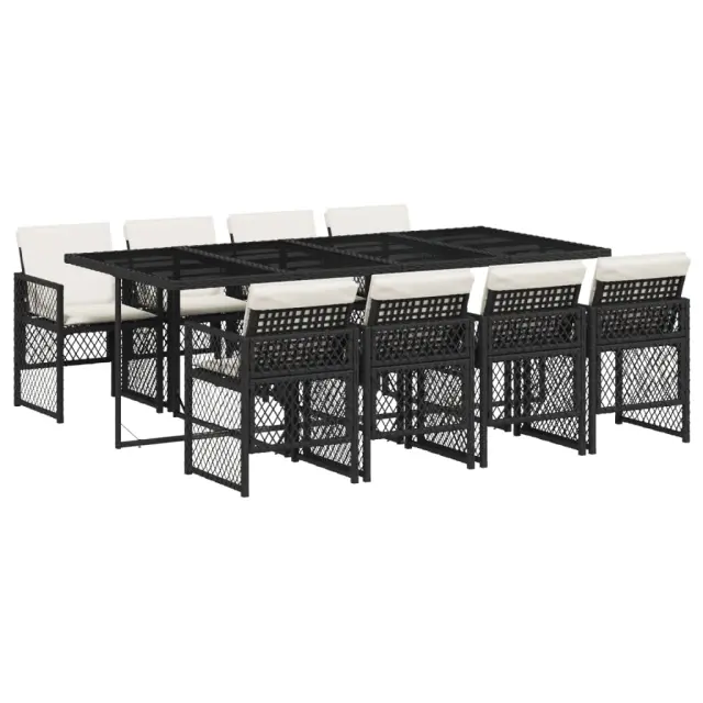Ta vrtna jedilna garnitura je odlična izbira za večerjo na prostem ali za sprostitev na vrtu, dvorišču ali terasi. Vzdržljiv material: PE ratan, znan tudi kot poli ratan, je močan sintetični material, ki zahteva malo vzdrževanja in je videti kot naravni ratan. Je lahek, enostaven za čiščenje in se zaradi svoje vzdržljivosti in odpornosti na vremenske vplive pogosto uporablja za zunanje pohištvo. Steklena mizna plošča: Površina zunanje mize je izdelana iz močnega in trpežnega kaljenega stekla, kar omogoča enostavno čiščenje z vlažno krpo in vašemu zunanjemu prostoru doda pridih elegance. Kompaktno shranjevanje: Te stole je mogoče zložiti, zato jih je enostavno shraniti pod mizo. Ko so zloženi, se lepo prilegajo pod mizo in tvorijo prostorsko varčno kocko. Udobno sedenje: To zunanje pohištvo z debelo oblazinjenimi blazinami zagotavlja udobno sedenje. Prevleko je mogoče odstraniti in oprati: Te sedežne blazine imajo odstranljive prevleke za lažje pranje in vzdrževanje. Prevleke za blazine za stole imajo na zadnji strani zavihek za enostavno pritrditev na stole. Dobro je vedeti:Če želite, da vaše zunanje pohištvo ostane lepo, vam priporočamo, da ga zaščitite z vodoodporno prevleko.Maksimalna nosilnost (na sedež): 110 kgUV-odpornoPotrebno sestavljanje: DaMiza:Barva: ČrnaMaterial: PE ratan, jeklo s prašnim premazom, kaljeno stekloDimenzije: 220 x 106 x 73 cm (D x Š x V)Stol:Barva: ČrnaMaterial: PE ratan, jeklen okvir s prašnim premazomDimenzije vrtnega stola: 50,5 x 54 x 79 cm (Š x G x V)Velikost sedeža: 45 x 38 cm (Š x G)Višina sedišča, merjena od tal: 43 cmVišina naslonjala za roke, merjena od tal: 64 cmBlazina:Barva: Kremno belaMaterial prevleke: Tkanina (100 % poliester)Material polnila: PenaDimenzije blazine za stol: 76 x 46 x 2 cm (D x Š x D)Dimenzije blazine za stolček: 40 x 40 x 2 cm (Š x G x D)Paket vsebuje:1 x Vrtna miza8 x Vrtni stol8 x Blazina za stol z visokim naslonom s snemljivo in pralno prevleko 3210738
