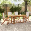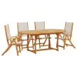 S to leseno vrtno jedilno garnituro lahko z družino in prijatelji uživate v prijetnem obroku na prostem. Trden akacijev les: Ta zunanja jedilna garnitura je izdelana iz trdnega akacijevega lesa. Trden akacijev les je čudovit naravni material. Akacijev les je tropski trden les, ki je gost, močan in vzdržljiv. Nastavljiva in zložljiva funkcija: Vrtni stol lahko nastavite v 5 položajev, tako da lahko vedno najdete najudobnejši položaj za sedenje. Lahko ga tudi zložite, da prihranite prostor, ko ga ne uporabljate. Praktična zasnova: Vrtna miza je posebej oblikovana tako, da jo je mogoče raztegniti, ko potrebujete dodaten prostor. Poleg tega je v mizni plošči luknja za senčnik, tako da lahko preprosto pritrdite senčnik in ustvarite senčni kotiček. Trpežna mizna plošča: Ta jedilna miza ima robustno mizno ploščo. Nanjo lahko odložite svoje prigrizke, pijačo in vse svoje najljubše okrasne predmete. Površina, ki je enostavna za čiščenje: Ta vrtna jedilna miza in stoli se zlahka očistijo z vlažno krpo: površina je obdelana z oljem. Dobro je vedeti:Če želite, da vaše zunanje pohištvo ostane lepo, vam priporočamo, da ga zaščitite z vodoodporno prevleko.Vrtna miza:Material: Trden akacijev les z oljnim premazomDimenzije: (150-200) x 100 x 74 cm (D x Š x V)RaztegljivaVrtni stol:Barva: SivaMaterial: Trden akacijev les z oljnim premazom, tekstilDimenzije: 57 x 72 x 109 cm (Š x G x V)Višina sedeža od tal: 45 cmVišina naslonjala za roke, merjena od tal: 66 cmNastavljivo naslonjalo (5 položajev)Maksimalna nosilnost (na sedež): 110 kgPotrebno sestavljanje: DaPaket vsebuje:1 x Vrtna miza4 x Vrtni stol 3279286