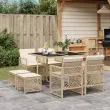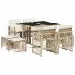 Ta vrtna jedilna garnitura je odlična izbira za večerjo na prostem ali za sprostitev na vrtu, dvorišču ali terasi. Vzdržljiv material: PE ratan, znan tudi kot poli ratan, je močan sintetični material, ki zahteva malo vzdrževanja in je videti kot naravni ratan. Je lahek, enostaven za čiščenje in se zaradi svoje vzdržljivosti in odpornosti na vremenske vplive pogosto uporablja za zunanje pohištvo. Steklena mizna plošča: Površina zunanje mize je izdelana iz močnega in trpežnega kaljenega stekla, kar omogoča enostavno čiščenje z vlažno krpo in vašemu zunanjemu prostoru doda pridih elegance. Kompaktno shranjevanje: Te stole je mogoče zložiti, zato jih je enostavno shraniti pod mizo. Ko so zloženi, se lepo prilegajo pod mizo in tvorijo prostorsko varčno kocko. Poleg tega je mogoče stolčke shraniti tudi pod stole, kar še poveča prostorsko učinkovitost. Udobno sedenje: To zunanje pohištvo z debelo oblazinjenimi blazinami zagotavlja udobno sedenje. Prevleko je mogoče odstraniti in oprati: Te sedežne blazine imajo odstranljive prevleke za lažje pranje in vzdrževanje. Prevleke za blazine za stole imajo na zadnji strani zavihek za enostavno pritrditev na stole. Dobro je vedeti:Če želite, da vaše zunanje pohištvo ostane lepo, vam priporočamo, da ga zaščitite z vodoodporno prevleko.Maksimalna nosilnost (na sedež): 110 kgUV-odpornoPotrebno sestavljanje: DaMiza:Barva: BežMaterial: PE ratan, jeklo s prašnim premazom, kaljeno stekloDimenzije: 110 x 106 x 73 cm (D x Š x V)Stol:Barva: BežMaterial: PE ratan, jeklen okvir s prašnim premazomDimenzije vrtnega stola: 50,5 x 54 x 79 cm (Š x G x V)Velikost sedeža: 45 x 38 cm (Š x G)Višina sedišča, merjena od tal: 43 cmVišina naslonjala za roke, merjena od tal: 64 cmDimenzije vrtnega stola: 41 x 41 x 36 cm (Š x G x V)Blazina:Barva: Kremno belaMaterial prevleke: Tkanina (100 % poliester)Material polnila: PenaDimenzije blazine za stol: 76 x 46 x 2 cm (D x Š x D)Dimenzije blazine za stolček: 40 x 40 x 2 cm (Š x G x D)Paket vsebuje:1 x Vrtna miza4 x Vrtni stol4 x Vrtni stolček4 x Blazina za stol z visokim naslonom s snemljivo in pralno prevleko4 x Blazina za stolček s snemljivo in pralno prevleko 3210778
