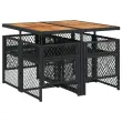 Ta vrtna jedilna garnitura je odlična izbira za večerjo na prostem ali za sprostitev na vrtu, dvorišču ali terasi. Vzdržljiv material: PE ratan, znan tudi kot poli ratan, je močan sintetični material, ki zahteva malo vzdrževanja in je videti kot naravni ratan. Je lahek, enostaven za čiščenje in se zaradi svoje vzdržljivosti in odpornosti na vremenske vplive pogosto uporablja za zunanje pohištvo. Stabilna mizna plošča, ki je enostavna za čiščenje: Ta vrtna miza ima ploščo iz akacijevega lesa, ki je čvrsta, vzdržljiva in jo je enostavno čistiti z vlažno krpo. Kompaktno shranjevanje: Te stole je mogoče zložiti, zato jih je enostavno shraniti pod mizo. Ko so zloženi, se lepo prilegajo pod mizo in tvorijo prostorsko varčno kocko. Udobno sedenje: To zunanje pohištvo z debelo oblazinjenimi blazinami zagotavlja udobno sedenje. Prevleko je mogoče odstraniti in oprati: Te sedežne blazine imajo odstranljive prevleke za lažje pranje in vzdrževanje. Prevleke za blazine za stole imajo na zadnji strani zavihek za enostavno pritrditev na stole. Dobro je vedeti:Če želite, da vaše zunanje pohištvo ostane lepo, vam priporočamo, da ga zaščitite z vodoodporno prevleko.Maksimalna nosilnost (na sedež): 110 kgUV-odpornoPotrebno sestavljanje: DaMiza:Barva: ČrnaMaterial: PE ratan, prašno premazano jeklo, trden akacijev les z oljnim premazomDimenzije: 110 x 106 x 73 cm (D x Š x V)Stol:Barva: ČrnaMaterial: PE ratan, jeklen okvir s prašnim premazomDimenzije vrtnega stola: 50,5 x 54 x 79 cm (Š x G x V)Velikost sedeža: 45 x 38 cm (Š x G)Višina sedišča, merjena od tal: 43 cmVišina naslonjala za roke, merjena od tal: 64 cmBlazina:Barva: Kremno belaMaterial prevleke: Tkanina (100 % poliester)Material polnila: PenaDimenzije blazine za stol: 76 x 46 x 2 cm (D x Š x D)Dimenzije blazine za stolček: 40 x 40 x 2 cm (Š x G x D)Paket vsebuje:1 x Vrtna miza4 x Vrtni stol4 x Blazina za stol z visokim naslonom s snemljivo in pralno prevleko 3210723