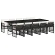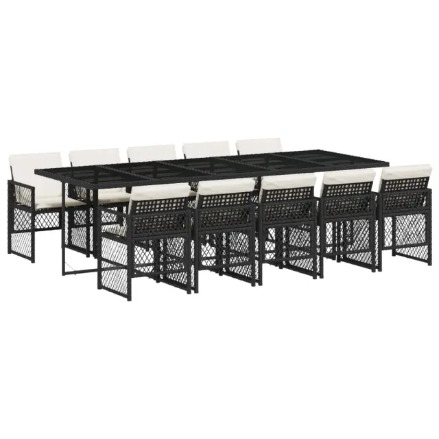 Ta vrtna jedilna garnitura je odlična izbira za večerjo na prostem ali za sprostitev na vrtu, dvorišču ali terasi. Vzdržljiv material: PE ratan, znan tudi kot poli ratan, je močan sintetični material, ki zahteva malo vzdrževanja in je videti kot naravni ratan. Je lahek, enostaven za čiščenje in se zaradi svoje vzdržljivosti in odpornosti na vremenske vplive pogosto uporablja za zunanje pohištvo. Steklena mizna plošča: Površina zunanje mize je izdelana iz močnega in trpežnega kaljenega stekla, kar omogoča enostavno čiščenje z vlažno krpo in vašemu zunanjemu prostoru doda pridih elegance. Kompaktno shranjevanje: Te stole je mogoče zložiti, zato jih je enostavno shraniti pod mizo. Ko so zloženi, se lepo prilegajo pod mizo in tvorijo prostorsko varčno kocko. Udobno sedenje: To zunanje pohištvo z debelo oblazinjenimi blazinami zagotavlja udobno sedenje. Prevleko je mogoče odstraniti in oprati: Te sedežne blazine imajo odstranljive prevleke za lažje pranje in vzdrževanje. Prevleke za blazine za stole imajo na zadnji strani zavihek za enostavno pritrditev na stole. Dobro je vedeti:Če želite, da vaše zunanje pohištvo ostane lepo, vam priporočamo, da ga zaščitite z vodoodporno prevleko.Maksimalna nosilnost (na sedež): 110 kgUV-odpornoPotrebno sestavljanje: DaMiza:Barva: ČrnaMaterial: PE ratan, jeklo s prašnim premazom, kaljeno stekloDimenzije: 275 x 106 x 73 cm (D x Š x V)Stol:Barva: ČrnaMaterial: PE ratan, jeklen okvir s prašnim premazomDimenzije vrtnega stola: 50,5 x 54 x 79 cm (Š x G x V)Velikost sedeža: 45 x 38 cm (Š x G)Višina sedišča, merjena od tal: 43 cmVišina naslonjala za roke, merjena od tal: 64 cmBlazina:Barva: Kremno belaMaterial prevleke: Tkanina (100 % poliester)Material polnila: PenaDimenzije blazine za stol: 76 x 46 x 2 cm (D x Š x D)Dimenzije blazine za stolček: 40 x 40 x 2 cm (Š x G x D)Paket vsebuje:1 x Vrtna miza10 x Vrtni stol10 x Blazina za stol z visokim naslonom s snemljivo in pralno prevleko 3210750