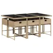 Ta vrtna jedilna garnitura je odlična izbira za večerjo na prostem ali za sprostitev na vrtu, dvorišču ali terasi. Vzdržljiv material: PE ratan, znan tudi kot poli ratan, je močan sintetični material, ki zahteva malo vzdrževanja in je videti kot naravni ratan. Je lahek, enostaven za čiščenje in se zaradi svoje vzdržljivosti in odpornosti na vremenske vplive pogosto uporablja za zunanje pohištvo.Kompaktno shranjevanje: Te stole je mogoče zložiti, zato jih je enostavno shraniti pod mizo. Ko so zloženi, se lepo prilegajo pod mizo in tvorijo prostorsko varčno kocko.Udobno sedenje: To zunanje pohištvo z debelo oblazinjenimi blazinami zagotavlja udobno sedenje.Prevleko je mogoče odstraniti in oprati: Te sedežne blazine imajo odstranljive prevleke za lažje pranje in vzdrževanje. Prevleke za blazine imajo na zadnji strani zavihek za enostavno pritrditev na naslonjala.Steklena mizna plošča: Površina zunanje mize je izdelana iz močnega in trpežnega kaljenega stekla, kar omogoča enostavno čiščenje z vlažno krpo in vašemu zunanjemu prostoru doda pridih elegance. Dobro je vedeti:Če želite, da vaše zunanje pohištvo ostane lepo, vam priporočamo, da ga zaščitite z vodoodporno prevleko.Maksimalna nosilnost (na sedež): 110 kgUV-odpornoPotrebno sestavljanje: DaMiza:Barva mize: BežBarva stekla: ČrnaMaterial: PE ratan, jeklo s prašnim premazom, kaljeno stekloDimenzije: 165 x 106 x 73 cm (D x Š x V)Stol:Barva: BežMaterial: PE ratan, jeklen okvir s prašnim premazomDimenzije: 50,5 x 50 x 79 cm (Š x G x V)Velikost sedišča: 45,5 x 38 cm (Š x G)Višina sedišča, merjena od tal: 43 cmVišina naslonjal za roke, merjena od tal: 63,5 cmBlazina:Barva: Kremno belaMaterial prevleke: Tkanina (100 % poliester)Material polnila: PenaDimenzije blazine za stol: 76 x 45,5 x 2 cm (D x Š x D)Paket vsebuje:1 x Vrtna miza6 x Vrtni stol6 x Blazina za stol z visokim naslonom s snemljivo in pralno prevleko 3278037