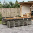 Ta vrtna jedilna garnitura je odlična izbira za večerjo na prostem ali za sprostitev na vrtu, dvorišču ali terasi. Vzdržljiv material: PE ratan, znan tudi kot poli ratan, je močan sintetični material, ki zahteva malo vzdrževanja in je videti kot naravni ratan. Je lahek, enostaven za čiščenje in se zaradi svoje vzdržljivosti in odpornosti na vremenske vplive pogosto uporablja za zunanje pohištvo. Stabilna mizna plošča, ki je enostavna za čiščenje: Ta vrtna miza ima ploščo iz akacijevega lesa, ki je čvrsta, vzdržljiva in jo je enostavno čistiti z vlažno krpo. Kompaktno shranjevanje: Te stole je mogoče zložiti, zato jih je enostavno shraniti pod mizo. Ko so zloženi, se lepo prilegajo pod mizo in tvorijo prostorsko varčno kocko. Udobno sedenje: To zunanje pohištvo z debelo oblazinjenimi blazinami zagotavlja udobno sedenje. Prevleko je mogoče odstraniti in oprati: Te sedežne blazine imajo odstranljive prevleke za lažje pranje in vzdrževanje. Prevleke za blazine za stole imajo na zadnji strani zavihek za enostavno pritrditev na stole. Dobro je vedeti:Če želite, da vaše zunanje pohištvo ostane lepo, vam priporočamo, da ga zaščitite z vodoodporno prevleko.Maksimalna nosilnost (na sedež): 110 kgUV-odpornoPotrebno sestavljanje: DaMiza:Barva: SivaMaterial: PE ratan, prašno premazano jeklo, trden akacijev les z oljnim premazomDimenzije: 275 x 106 x 73 cm (D x Š x V)Stol:Barva: SivaMaterial: PE ratan, jeklen okvir s prašnim premazomDimenzije vrtnega stola: 50,5 x 54 x 79 cm (Š x G x V)Velikost sedeža: 45 x 38 cm (Š x G)Višina sedišča, merjena od tal: 43 cmVišina naslonjala za roke, merjena od tal: 64 cmBlazina:Barva: Temno sivaMaterial prevleke: Tkanina (100 % poliester)Material polnila: PenaDimenzije blazine za stol: 76 x 46 x 2 cm (D x Š x D)Dimenzije blazine za stolček: 40 x 40 x 2 cm (Š x G x D)Paket vsebuje:1 x Vrtna miza10 x Vrtni stol10 x Blazina za stol z visokim naslonom s snemljivo in pralno prevleko 3210758