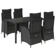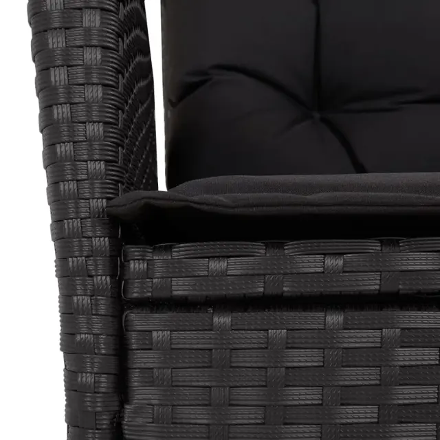 Ta vrtna jedilna garnitura je odlična izbira za večerjo na prostem ali za sprostitev na vrtu, dvorišču ali terasi. Vzdržljiv material: PE ratan, znan tudi kot poli ratan, je močan sintetični material, ki zahteva malo vzdrževanja in je videti kot naravni ratan. Je lahek, enostaven za čiščenje in se zaradi svoje vzdržljivosti in odpornosti na vremenske vplive pogosto uporablja za zunanje pohištvo.Nastavljivo naslonjalo: Ta vrtni sedež ima ročaj. S potegom ročaja lahko naslonjalo nastavite v poljuben položaj in ga hitro vrnete v prvotni položaj.Udobno sedenje: To zunanje pohištvo z debelo oblazinjenimi blazinami zagotavlja udobno sedenje.Prevleko je mogoče odstraniti in oprati: Te sedežne blazine imajo odstranljive prevleke za lažje pranje in vzdrževanje. Hrbtne blazine imajo na zadnji strani zavihek za enostavno pritrditev na naslonjala.Steklena mizna plošča: Površina zunanje mize je izdelana iz močnega in trpežnega kaljenega stekla, kar omogoča enostavno čiščenje z vlažno krpo in vašemu zunanjemu prostoru doda pridih elegance. Dobro je vedeti: Če želite, da vaše zunanje pohištvo ostane lepo, vam priporočamo, da ga zaščitite z vodoodporno prevleko.Maksimalna nosilnost (na sedež): 110 kgUV-odpornoPotrebno sestavljanje: DaMiza:Barva: ČrnaMaterial: PE ratan, jeklo s prašnim premazom, kaljeno stekloDimenzije: 150 x 90 x 75 cm (D x Š x V)Vrtni naslanjač:Barva: ČrnaMaterial: PE ratan, jeklen okvir s prašnim premazomDimenzije v sedečem položaju: 57 x 61 x 93 cm (Š x G x V)Dimenzije v ležečem položaju: 57 x 86 x 83 cm (Š x G x V)Velikost sedeža: 47 x 50 cm (Š x G)Višina sedeža od tal: 44 cmVišina naslonjala za roke, merjena od tal: 64 cmBlazina:Barva: ČrnaMaterial prevleke: Tkanina (100 % poliester)Polnilo sedežne blazine: PenaPolnilo hrbtne blazine: bombažna vlaknaDimenzije sedežne blazine: 48 x 51 x 3 cm (Š x G x D)Dimenzije hrbtne blazine: 66 x 48 x 11 cm (D x Š x D)Paket vsebuje:1 x Vrtna miza4 x Vrtni stol s funkcijo nagiba4 x Blazina za hrbet4 x Sedežna blazina s snemljivo in pralno prevleko 3213070