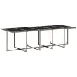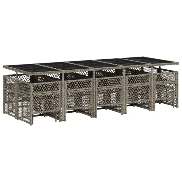 Ta vrtna jedilna garnitura je odlična izbira za večerjo na prostem ali za sprostitev na vrtu, dvorišču ali terasi. Vzdržljiv material: PE ratan, znan tudi kot poli ratan, je močan sintetični material, ki zahteva malo vzdrževanja in je videti kot naravni ratan. Je lahek, enostaven za čiščenje in se zaradi svoje vzdržljivosti in odpornosti na vremenske vplive pogosto uporablja za zunanje pohištvo. Steklena mizna plošča: Površina zunanje mize je izdelana iz močnega in trpežnega kaljenega stekla, kar omogoča enostavno čiščenje z vlažno krpo in vašemu zunanjemu prostoru doda pridih elegance. Kompaktno shranjevanje: Te stole je mogoče zložiti, zato jih je enostavno shraniti pod mizo. Ko so zloženi, se lepo prilegajo pod mizo in tvorijo prostorsko varčno kocko. Poleg tega je mogoče stolčke shraniti tudi pod stole, kar še poveča prostorsko učinkovitost. Udobno sedenje: To zunanje pohištvo z debelo oblazinjenimi blazinami zagotavlja udobno sedenje. Prevleko je mogoče odstraniti in oprati: Te sedežne blazine imajo odstranljive prevleke za lažje pranje in vzdrževanje. Prevleke za blazine za stole imajo na zadnji strani zavihek za enostavno pritrditev na stole. Dobro je vedeti:Če želite, da vaše zunanje pohištvo ostane lepo, vam priporočamo, da ga zaščitite z vodoodporno prevleko.Maksimalna nosilnost (na sedež): 110 kgUV-odpornoPotrebno sestavljanje: DaMiza:Barva: SivaMaterial: PE ratan, jeklo s prašnim premazom, kaljeno stekloDimenzije: 275 x 106 x 73 cm (D x Š x V)Stol:Barva: SivaMaterial: PE ratan, jeklen okvir s prašnim premazomDimenzije vrtnega stola: 50,5 x 54 x 79 cm (Š x G x V)Velikost sedeža: 45 x 38 cm (Š x G)Višina sedišča, merjena od tal: 43 cmVišina naslonjala za roke, merjena od tal: 64 cmDimenzije vrtnega stola: 41 x 41 x 36 cm (Š x G x V)Blazina:Barva: Temno sivaMaterial prevleke: Tkanina (100 % poliester)Material polnila: PenaDimenzije blazine za stol: 76 x 46 x 2 cm (D x Š x D)Dimenzije blazine za stolček: 40 x 40 x 2 cm (Š x G x D)Paket vsebuje:1 x Vrtna miza10 x Vrtni stol4 x Vrtni stolček10 x Blazina za stol z visokim naslonom s snemljivo in pralno prevleko4 x Blazina za stolček s snemljivo in pralno prevleko 3210812