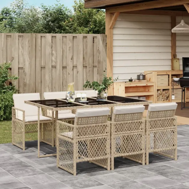Ta vrtna jedilna garnitura je odlična izbira za večerjo na prostem ali za sprostitev na vrtu, dvorišču ali terasi. Vzdržljiv material: PE ratan, znan tudi kot poli ratan, je močan sintetični material, ki zahteva malo vzdrževanja in je videti kot naravni ratan. Je lahek, enostaven za čiščenje in se zaradi svoje vzdržljivosti in odpornosti na vremenske vplive pogosto uporablja za zunanje pohištvo. Steklena mizna plošča: Površina zunanje mize je izdelana iz močnega in trpežnega kaljenega stekla, kar omogoča enostavno čiščenje z vlažno krpo in vašemu zunanjemu prostoru doda pridih elegance. Kompaktno shranjevanje: Te stole je mogoče zložiti, zato jih je enostavno shraniti pod mizo. Ko so zloženi, se lepo prilegajo pod mizo in tvorijo prostorsko varčno kocko. Udobno sedenje: To zunanje pohištvo z debelo oblazinjenimi blazinami zagotavlja udobno sedenje. Prevleko je mogoče odstraniti in oprati: Te sedežne blazine imajo odstranljive prevleke za lažje pranje in vzdrževanje. Prevleke za blazine za stole imajo na zadnji strani zavihek za enostavno pritrditev na stole. Dobro je vedeti:Če želite, da vaše zunanje pohištvo ostane lepo, vam priporočamo, da ga zaščitite z vodoodporno prevleko.Maksimalna nosilnost (na sedež): 110 kgUV-odpornoPotrebno sestavljanje: DaMiza:Barva: BežMaterial: PE ratan, jeklo s prašnim premazom, kaljeno stekloDimenzije: 165 x 106 x 73 cm (D x Š x V)Stol:Barva: BežMaterial: PE ratan, jeklen okvir s prašnim premazomDimenzije vrtnega stola: 50,5 x 54 x 79 cm (Š x G x V)Velikost sedeža: 45 x 38 cm (Š x G)Višina sedišča, merjena od tal: 43 cmVišina naslonjala za roke, merjena od tal: 64 cmBlazina:Barva: Kremno belaMaterial prevleke: Tkanina (100 % poliester)Material polnila: PenaDimenzije blazine za stol: 76 x 46 x 2 cm (D x Š x D)Dimenzije blazine za stolček: 40 x 40 x 2 cm (Š x G x D)Paket vsebuje:1 x Vrtna miza6 x Vrtni stol6 x Blazina za stol z visokim naslonom s snemljivo in pralno prevleko 3210730