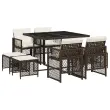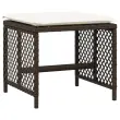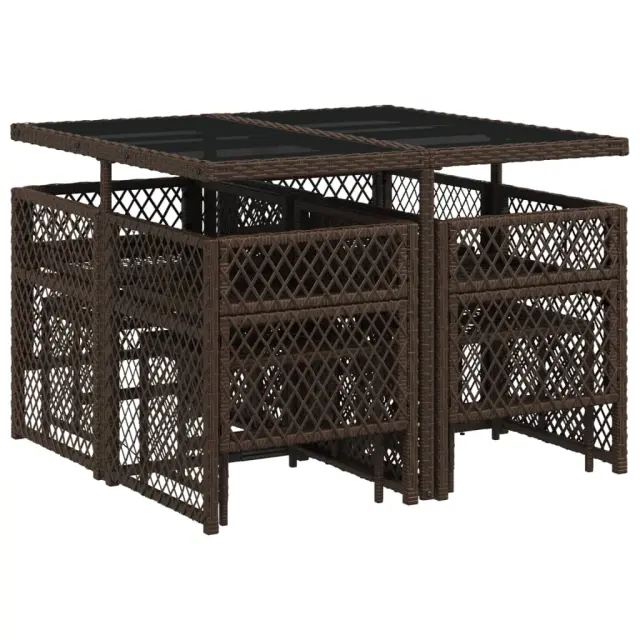 Ta vrtna jedilna garnitura je odlična izbira za večerjo na prostem ali za sprostitev na vrtu, dvorišču ali terasi. Vzdržljiv material: PE ratan, znan tudi kot poli ratan, je močan sintetični material, ki zahteva malo vzdrževanja in je videti kot naravni ratan. Je lahek, enostaven za čiščenje in se zaradi svoje vzdržljivosti in odpornosti na vremenske vplive pogosto uporablja za zunanje pohištvo. Steklena mizna plošča: Površina zunanje mize je izdelana iz močnega in trpežnega kaljenega stekla, kar omogoča enostavno čiščenje z vlažno krpo in vašemu zunanjemu prostoru doda pridih elegance. Kompaktno shranjevanje: Te stole je mogoče zložiti, zato jih je enostavno shraniti pod mizo. Ko so zloženi, se lepo prilegajo pod mizo in tvorijo prostorsko varčno kocko. Poleg tega je mogoče stolčke shraniti tudi pod stole, kar še poveča prostorsko učinkovitost. Udobno sedenje: To zunanje pohištvo z debelo oblazinjenimi blazinami zagotavlja udobno sedenje. Prevleko je mogoče odstraniti in oprati: Te sedežne blazine imajo odstranljive prevleke za lažje pranje in vzdrževanje. Prevleke za blazine za stole imajo na zadnji strani zavihek za enostavno pritrditev na stole. Dobro je vedeti:Če želite, da vaše zunanje pohištvo ostane lepo, vam priporočamo, da ga zaščitite z vodoodporno prevleko.Maksimalna nosilnost (na sedež): 110 kgUV-odpornoPotrebno sestavljanje: DaMiza:Barva: RjavaMaterial: PE ratan, jeklo s prašnim premazom, kaljeno stekloDimenzije: 110 x 106 x 73 cm (D x Š x V)Stol:Barva: RjavaMaterial: PE ratan, jeklen okvir s prašnim premazomDimenzije vrtnega stola: 50,5 x 54 x 79 cm (Š x G x V)Velikost sedeža: 45 x 38 cm (Š x G)Višina sedišča, merjena od tal: 43 cmVišina naslonjala za roke, merjena od tal: 64 cmDimenzije vrtnega stola: 41 x 41 x 36 cm (Š x G x V)Blazina:Barva: Kremno belaMaterial prevleke: Tkanina (100 % poliester)Material polnila: PenaDimenzije blazine za stol: 76 x 46 x 2 cm (D x Š x D)Dimenzije blazine za stolček: 40 x 40 x 2 cm (Š x G x D)Paket vsebuje:1 x Vrtna miza4 x Vrtni stol4 x Vrtni stolček4 x Blazina za stol z visokim naslonom s snemljivo in pralno prevleko4 x Blazina za stolček s snemljivo in pralno prevleko 3210777