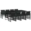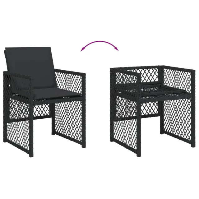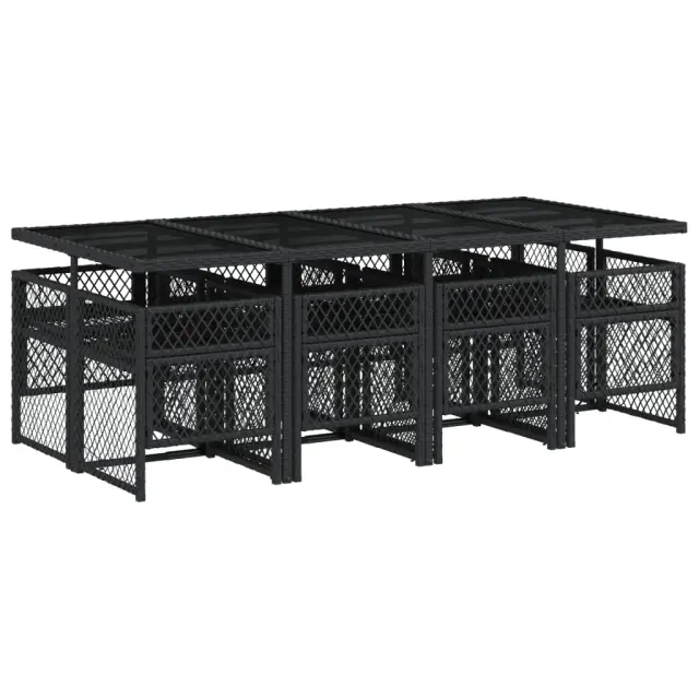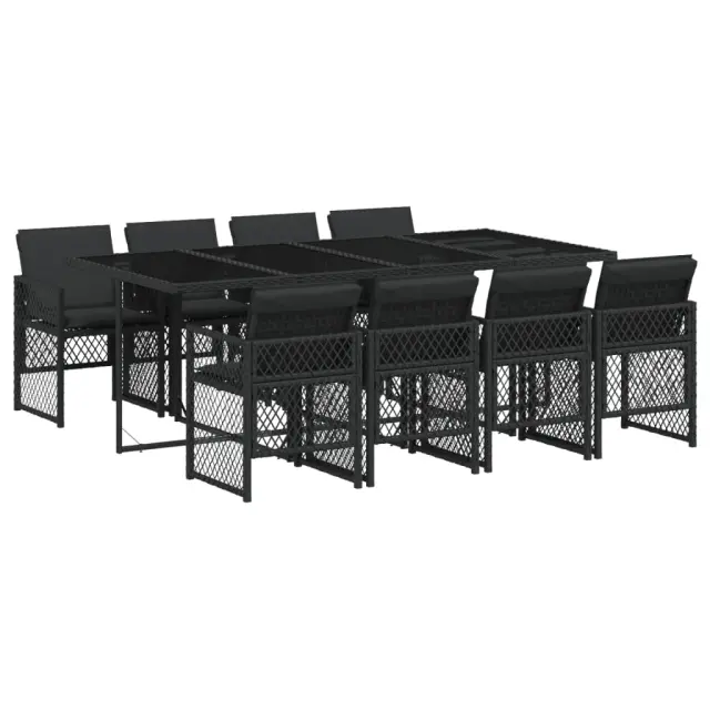 Ta vrtna jedilna garnitura je odlična izbira za večerjo na prostem ali za sprostitev na vrtu, dvorišču ali terasi. Vzdržljiv material: PE ratan, znan tudi kot poli ratan, je močan sintetični material, ki zahteva malo vzdrževanja in je videti kot naravni ratan. Je lahek, enostaven za čiščenje in se zaradi svoje vzdržljivosti in odpornosti na vremenske vplive pogosto uporablja za zunanje pohištvo. Steklena mizna plošča: Površina zunanje mize je izdelana iz močnega in trpežnega kaljenega stekla, kar omogoča enostavno čiščenje z vlažno krpo in vašemu zunanjemu prostoru doda pridih elegance. Kompaktno shranjevanje: Te stole je mogoče zložiti, zato jih je enostavno shraniti pod mizo. Ko so zloženi, se lepo prilegajo pod mizo in tvorijo prostorsko varčno kocko. Udobno sedenje: To zunanje pohištvo z debelo oblazinjenimi blazinami zagotavlja udobno sedenje. Prevleko je mogoče odstraniti in oprati: Te sedežne blazine imajo odstranljive prevleke za lažje pranje in vzdrževanje. Prevleke za blazine za stole imajo na zadnji strani zavihek za enostavno pritrditev na stole. Dobro je vedeti:Če želite, da vaše zunanje pohištvo ostane lepo, vam priporočamo, da ga zaščitite z vodoodporno prevleko.Maksimalna nosilnost (na sedež): 110 kgUV-odpornoPotrebno sestavljanje: DaMiza:Barva: ČrnaMaterial: PE ratan, jeklo s prašnim premazom, kaljeno stekloDimenzije: 220 x 106 x 73 cm (D x Š x V)Stol:Barva: ČrnaMaterial: PE ratan, jeklen okvir s prašnim premazomDimenzije vrtnega stola: 50,5 x 54 x 79 cm (Š x G x V)Velikost sedeža: 45 x 38 cm (Š x G)Višina sedišča, merjena od tal: 43 cmVišina naslonjala za roke, merjena od tal: 64 cmBlazina:Barva: ČrnaMaterial prevleke: Tkanina (100 % poliester)Material polnila: PenaDimenzije blazine za stol: 76 x 46 x 2 cm (D x Š x D)Dimenzije blazine za stolček: 40 x 40 x 2 cm (Š x G x D)Paket vsebuje:1 x Vrtna miza8 x Vrtni stol8 x Blazina za stol z visokim naslonom s snemljivo in pralno prevleko 3210739