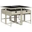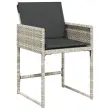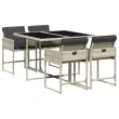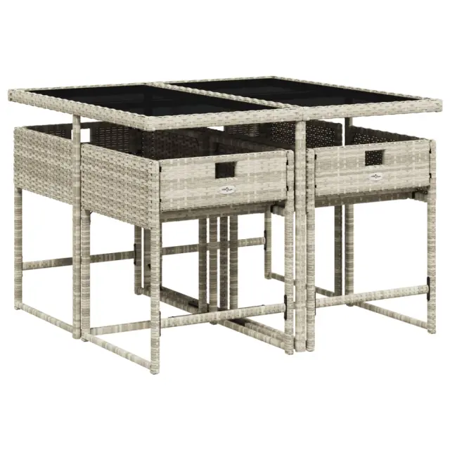 Ta vrtna jedilna garnitura je odlična izbira za večerjo na prostem ali za sprostitev na vrtu, dvorišču ali terasi. Vzdržljiv material: PE ratan, znan tudi kot poli ratan, je močan sintetični material, ki zahteva malo vzdrževanja in je videti kot naravni ratan. Je lahek, enostaven za čiščenje in se zaradi svoje vzdržljivosti in odpornosti na vremenske vplive pogosto uporablja za zunanje pohištvo.Kompaktno shranjevanje: Te stole je mogoče zložiti, zato jih je enostavno shraniti pod mizo. Ko so zloženi, se lepo prilegajo pod mizo in tvorijo prostorsko varčno kocko.Udobno sedenje: To zunanje pohištvo z debelo oblazinjenimi blazinami zagotavlja udobno sedenje.Prevleko je mogoče odstraniti in oprati: Te sedežne blazine imajo odstranljive prevleke za lažje pranje in vzdrževanje. Prevleke za blazine imajo na zadnji strani zavihek za enostavno pritrditev na naslonjala.Steklena mizna plošča: Površina zunanje mize je izdelana iz močnega in trpežnega kaljenega stekla, kar omogoča enostavno čiščenje z vlažno krpo in vašemu zunanjemu prostoru doda pridih elegance. Dobro je vedeti:Če želite, da vaše zunanje pohištvo ostane lepo, vam priporočamo, da ga zaščitite z vodoodporno prevleko.Maksimalna nosilnost (na sedež): 110 kgUV-odpornoPotrebno sestavljanje: DaMiza:Barva mize: Svetlo sivaBarva stekla: ČrnaMaterial: PE ratan, jeklo s prašnim premazom, kaljeno stekloDimenzije: 110 x 106 x 73 cm (D x Š x V)Stol:Barva: Svetlo sivaMaterial: PE ratan, jeklen okvir s prašnim premazomDimenzije: 50,5 x 50 x 79 cm (Š x G x V)Velikost sedišča: 45,5 x 38 cm (Š x G)Višina sedišča, merjena od tal: 43 cmVišina naslonjal za roke, merjena od tal: 63,5 cmBlazina:Barva: AntracitnaMaterial prevleke: Tkanina (100 % poliester)Material polnila: PenaDimenzije blazine za stol: 76 x 45,5 x 2 cm (D x Š x D)Paket vsebuje:1 x Vrtna miza4 x Vrtni stol4 x Blazina za stol z visokim naslonom s snemljivo in pralno prevleko 3278026