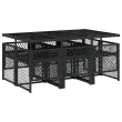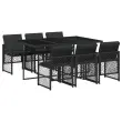 Ta vrtna jedilna garnitura je odlična izbira za večerjo na prostem ali za sprostitev na vrtu, dvorišču ali terasi. Vzdržljiv material: PE ratan, znan tudi kot poli ratan, je močan sintetični material, ki zahteva malo vzdrževanja in je videti kot naravni ratan. Je lahek, enostaven za čiščenje in se zaradi svoje vzdržljivosti in odpornosti na vremenske vplive pogosto uporablja za zunanje pohištvo. Steklena mizna plošča: Površina zunanje mize je izdelana iz močnega in trpežnega kaljenega stekla, kar omogoča enostavno čiščenje z vlažno krpo in vašemu zunanjemu prostoru doda pridih elegance. Kompaktno shranjevanje: Te stole je mogoče zložiti, zato jih je enostavno shraniti pod mizo. Ko so zloženi, se lepo prilegajo pod mizo in tvorijo prostorsko varčno kocko. Udobno sedenje: To zunanje pohištvo z debelo oblazinjenimi blazinami zagotavlja udobno sedenje. Prevleko je mogoče odstraniti in oprati: Te sedežne blazine imajo odstranljive prevleke za lažje pranje in vzdrževanje. Prevleke za blazine za stole imajo na zadnji strani zavihek za enostavno pritrditev na stole. Dobro je vedeti:Če želite, da vaše zunanje pohištvo ostane lepo, vam priporočamo, da ga zaščitite z vodoodporno prevleko.Maksimalna nosilnost (na sedež): 110 kgUV-odpornoPotrebno sestavljanje: DaMiza:Barva: ČrnaMaterial: PE ratan, jeklo s prašnim premazom, kaljeno stekloDimenzije: 165 x 106 x 73 cm (D x Š x V)Stol:Barva: ČrnaMaterial: PE ratan, jeklen okvir s prašnim premazomDimenzije vrtnega stola: 50,5 x 54 x 79 cm (Š x G x V)Velikost sedeža: 45 x 38 cm (Š x G)Višina sedišča, merjena od tal: 43 cmVišina naslonjala za roke, merjena od tal: 64 cmBlazina:Barva: ČrnaMaterial prevleke: Tkanina (100 % poliester)Material polnila: PenaDimenzije blazine za stol: 76 x 46 x 2 cm (D x Š x D)Dimenzije blazine za stolček: 40 x 40 x 2 cm (Š x G x D)Paket vsebuje:1 x Vrtna miza6 x Vrtni stol6 x Blazina za stol z visokim naslonom s snemljivo in pralno prevleko 3210727