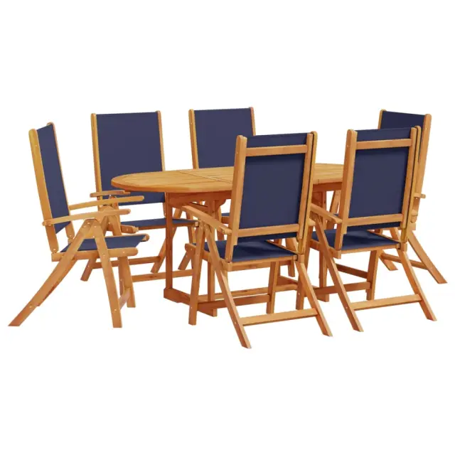 S to leseno vrtno jedilno garnituro lahko z družino in prijatelji uživate v prijetnem obroku na prostem. Trden akacijev les: Ta zunanja jedilna garnitura je izdelana iz trdnega akacijevega lesa. Trden akacijev les je čudovit naravni material. Akacijev les je tropski trden les, ki je gost, močan in vzdržljiv. Nastavljiva in zložljiva funkcija: Vrtni stol lahko nastavite v 5 položajev, tako da lahko vedno najdete najudobnejši položaj za sedenje. Lahko ga tudi zložite, da prihranite prostor, ko ga ne uporabljate. Praktična zasnova: Vrtna miza je posebej oblikovana tako, da jo je mogoče raztegniti, ko potrebujete dodaten prostor. Poleg tega je v mizni plošči luknja za senčnik, tako da lahko preprosto pritrdite senčnik in ustvarite senčni kotiček. Trpežna mizna plošča: Ta jedilna miza ima robustno mizno ploščo. Nanjo lahko odložite svoje prigrizke, pijačo in vse svoje najljubše okrasne predmete. Površina, ki je enostavna za čiščenje: Ta vrtna jedilna miza in stoli se zlahka očistijo z vlažno krpo: površina je obdelana z oljem. Dobro je vedeti:Če želite, da vaše zunanje pohištvo ostane lepo, vam priporočamo, da ga zaščitite z vodoodporno prevleko.Vrtna miza:Material: Trden akacijev les z oljnim premazomDimenzije: (120-170) x 80 x 75 cm (D x Š x V)RaztegljivaVrtni stol:Barva: ModraMaterial: Trden akacijev les z oljnim premazom, tekstilDimenzije: 57 x 72 x 109 cm (Š x G x V)Višina sedeža od tal: 45 cmVišina naslonjala za roke, merjena od tal: 66 cmNastavljivo naslonjalo (5 položajev)Maksimalna nosilnost (na sedež): 110 kgPotrebno sestavljanje: DaPaket vsebuje:1 x Vrtna miza6 x Vrtni stol 3279309
