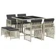 Ta vrtna jedilna garnitura je odlična izbira za večerjo na prostem ali za sprostitev na vrtu, dvorišču ali terasi. Vzdržljiv material: PE ratan, znan tudi kot poli ratan, je močan sintetični material, ki zahteva malo vzdrževanja in je videti kot naravni ratan. Je lahek, enostaven za čiščenje in se zaradi svoje vzdržljivosti in odpornosti na vremenske vplive pogosto uporablja za zunanje pohištvo. Steklena mizna plošča: Površina zunanje mize je izdelana iz močnega in trpežnega kaljenega stekla, kar omogoča enostavno čiščenje z vlažno krpo in vašemu zunanjemu prostoru doda pridih elegance. Kompaktno shranjevanje: Te stole je mogoče zložiti, zato jih je enostavno shraniti pod mizo. Ko so zloženi, se lepo prilegajo pod mizo in tvorijo prostorsko varčno kocko. Poleg tega je mogoče stolčke shraniti tudi pod stole, kar še poveča prostorsko učinkovitost. Udobno sedenje: To zunanje pohištvo z debelo oblazinjenimi blazinami zagotavlja udobno sedenje. Prevleko je mogoče odstraniti in oprati: Te sedežne blazine imajo odstranljive prevleke za lažje pranje in vzdrževanje. Prevleke za blazine za stole imajo na zadnji strani zavihek za enostavno pritrditev na stole. Dobro je vedeti:Če želite, da vaše zunanje pohištvo ostane lepo, vam priporočamo, da ga zaščitite z vodoodporno prevleko.Maksimalna nosilnost (na sedež): 110 kgUV-odpornoPotrebno sestavljanje: DaMiza:Barva: Svetlo sivaMaterial: PE ratan, jeklo s prašnim premazom, kaljeno stekloDimenzije: 110 x 106 x 73 cm (D x Š x V)Stol:Barva: Svetlo sivaMaterial: PE ratan, jeklen okvir s prašnim premazomDimenzije vrtnega stola: 50,5 x 54 x 79 cm (Š x G x V)Velikost sedeža: 45 x 38 cm (Š x G)Višina sedišča, merjena od tal: 43 cmVišina naslonjala za roke, merjena od tal: 64 cmDimenzije vrtnega stola: 41 x 41 x 36 cm (Š x G x V)Blazina:Barva: AntracitnaMaterial prevleke: Tkanina (100 % poliester)Material polnila: PenaDimenzije blazine za stol: 76 x 46 x 2 cm (D x Š x D)Dimenzije blazine za stolček: 40 x 40 x 2 cm (Š x G x D)Paket vsebuje:1 x Vrtna miza4 x Vrtni stol4 x Vrtni stolček4 x Blazina za stol z visokim naslonom s snemljivo in pralno prevleko4 x Blazina za stolček s snemljivo in pralno prevleko 3210779