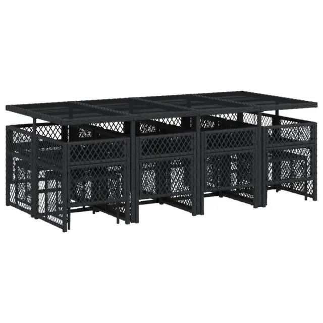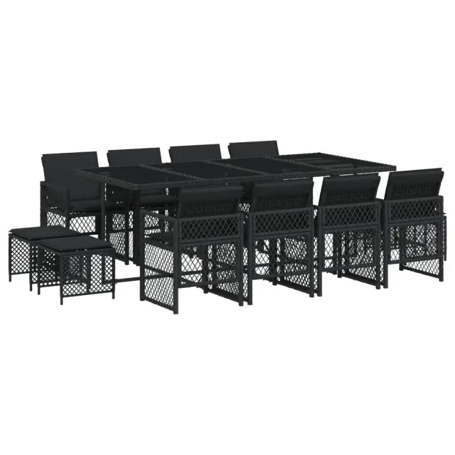 Ta vrtna jedilna garnitura je odlična izbira za večerjo na prostem ali za sprostitev na vrtu, dvorišču ali terasi. Vzdržljiv material: PE ratan, znan tudi kot poli ratan, je močan sintetični material, ki zahteva malo vzdrževanja in je videti kot naravni ratan. Je lahek, enostaven za čiščenje in se zaradi svoje vzdržljivosti in odpornosti na vremenske vplive pogosto uporablja za zunanje pohištvo. Steklena mizna plošča: Površina zunanje mize je izdelana iz močnega in trpežnega kaljenega stekla, kar omogoča enostavno čiščenje z vlažno krpo in vašemu zunanjemu prostoru doda pridih elegance. Kompaktno shranjevanje: Te stole je mogoče zložiti, zato jih je enostavno shraniti pod mizo. Ko so zloženi, se lepo prilegajo pod mizo in tvorijo prostorsko varčno kocko. Poleg tega je mogoče stolčke shraniti tudi pod stole, kar še poveča prostorsko učinkovitost. Udobno sedenje: To zunanje pohištvo z debelo oblazinjenimi blazinami zagotavlja udobno sedenje. Prevleko je mogoče odstraniti in oprati: Te sedežne blazine imajo odstranljive prevleke za lažje pranje in vzdrževanje. Prevleke za blazine za stole imajo na zadnji strani zavihek za enostavno pritrditev na stole. Dobro je vedeti:Če želite, da vaše zunanje pohištvo ostane lepo, vam priporočamo, da ga zaščitite z vodoodporno prevleko.Maksimalna nosilnost (na sedež): 110 kgUV-odpornoPotrebno sestavljanje: DaMiza:Barva: ČrnaMaterial: PE ratan, jeklo s prašnim premazom, kaljeno stekloDimenzije: 220 x 106 x 73 cm (D x Š x V)Stol:Barva: ČrnaMaterial: PE ratan, jeklen okvir s prašnim premazomDimenzije vrtnega stola: 50,5 x 54 x 79 cm (Š x G x V)Velikost sedeža: 45 x 38 cm (Š x G)Višina sedišča, merjena od tal: 43 cmVišina naslonjala za roke, merjena od tal: 64 cmDimenzije vrtnega stola: 41 x 41 x 36 cm (Š x G x V)Blazina:Barva: ČrnaMaterial prevleke: Tkanina (100 % poliester)Material polnila: PenaDimenzije blazine za stol: 76 x 46 x 2 cm (D x Š x D)Dimenzije blazine za stolček: 40 x 40 x 2 cm (Š x G x D)Paket vsebuje:1 x Vrtna miza8 x Vrtni stol4 x Vrtni stolček8 x Blazina za stol z visokim naslonom s snemljivo in pralno prevleko4 x Blazina za stolček s snemljivo in pralno prevleko 3210799