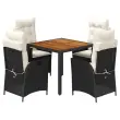 Ta vrtna jedilna garnitura je odlična izbira za večerjo na prostem ali za sprostitev na vrtu, dvorišču ali terasi. Vzdržljiv material: PE ratan, znan tudi kot poli ratan, je močan sintetični material, ki zahteva malo vzdrževanja in je videti kot naravni ratan. Je lahek, enostaven za čiščenje in se zaradi svoje vzdržljivosti in odpornosti na vremenske vplive pogosto uporablja za zunanje pohištvo.Nastavljivo naslonjalo: Ta vrtni sedež ima ročaj. S potegom ročaja lahko naslonjalo nastavite v poljuben položaj in ga hitro vrnete v prvotni položaj.Udobno sedenje: To zunanje pohištvo z debelo oblazinjenimi blazinami zagotavlja udobno sedenje.Prevleko je mogoče odstraniti in oprati: Te sedežne blazine imajo odstranljive prevleke za lažje pranje in vzdrževanje. Hrbtne blazine imajo na zadnji strani zavihek za enostavno pritrditev na naslonjala.Stabilna mizna plošča, ki je enostavna za čiščenje: Ta vrtna miza ima ploščo iz akacijevega lesa, ki je čvrsta, vzdržljiva in jo je enostavno čistiti z vlažno krpo. Dobro je vedeti: Če želite, da vaše zunanje pohištvo ostane lepo, vam priporočamo, da ga zaščitite z vodoodporno prevleko.Maksimalna nosilnost (na sedež): 110 kgUV-odpornoPotrebno sestavljanje: DaMiza:Barva: ČrnaMaterial: PE ratan, prašno premazano jeklo, trden akacijev les z oljnim premazomDimenzije: 90 x 90 x 75 cm (D x Š x V)Vrtni naslanjač:Barva: ČrnaMaterial: PE ratan, jeklen okvir s prašnim premazomDimenzije v sedečem položaju: 57 x 61 x 93 cm (Š x G x V)Dimenzije v ležečem položaju: 57 x 86 x 83 cm (Š x G x V)Velikost sedeža: 47 x 50 cm (Š x G)Višina sedeža od tal: 44 cmVišina naslonjala za roke, merjena od tal: 64 cmBlazina:Barva: Kremno belaMaterial prevleke: Tkanina (100 % poliester)Polnilo sedežne blazine: PenaPolnilo hrbtne blazine: bombažna vlaknaDimenzije sedežne blazine: 48 x 51 x 3 cm (Š x G x D)Dimenzije hrbtne blazine: 66 x 48 x 11 cm (D x Š x D)Paket vsebuje:1 x Vrtna miza4 x Vrtni stol s funkcijo nagiba4 x Blazina za hrbet4 x Sedežna blazina s snemljivo in pralno prevleko 3213086