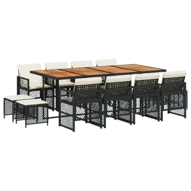 Ta vrtna jedilna garnitura je odlična izbira za večerjo na prostem ali za sprostitev na vrtu, dvorišču ali terasi. Vzdržljiv material: PE ratan, znan tudi kot poli ratan, je močan sintetični material, ki zahteva malo vzdrževanja in je videti kot naravni ratan. Je lahek, enostaven za čiščenje in se zaradi svoje vzdržljivosti in odpornosti na vremenske vplive pogosto uporablja za zunanje pohištvo. Stabilna mizna plošča, ki je enostavna za čiščenje: Ta vrtna miza ima ploščo iz akacijevega lesa, ki je čvrsta, vzdržljiva in jo je enostavno čistiti z vlažno krpo. Kompaktno shranjevanje: Te stole je mogoče zložiti, zato jih je enostavno shraniti pod mizo. Ko so zloženi, se lepo prilegajo pod mizo in tvorijo prostorsko varčno kocko. Poleg tega je mogoče stolčke shraniti tudi pod stole, kar še poveča prostorsko učinkovitost. Udobno sedenje: To zunanje pohištvo z debelo oblazinjenimi blazinami zagotavlja udobno sedenje. Prevleko je mogoče odstraniti in oprati: Te sedežne blazine imajo odstranljive prevleke za lažje pranje in vzdrževanje. Prevleke za blazine za stole imajo na zadnji strani zavihek za enostavno pritrditev na stole. Dobro je vedeti:Če želite, da vaše zunanje pohištvo ostane lepo, vam priporočamo, da ga zaščitite z vodoodporno prevleko.Maksimalna nosilnost (na sedež): 110 kgUV-odpornoPotrebno sestavljanje: DaMiza:Barva: ČrnaMaterial: PE ratan, prašno premazano jeklo, trden akacijev les z oljnim premazomDimenzije: 220 x 106 x 73 cm (D x Š x V)Stol:Barva: ČrnaMaterial: PE ratan, jeklen okvir s prašnim premazomDimenzije vrtnega stola: 50,5 x 54 x 79 cm (Š x G x V)Velikost sedeža: 45 x 38 cm (Š x G)Višina sedišča, merjena od tal: 43 cmVišina naslonjala za roke, merjena od tal: 64 cmDimenzije vrtnega stola: 41 x 41 x 36 cm (Š x G x V)Blazina:Barva: Kremno belaMaterial prevleke: Tkanina (100 % poliester)Material polnila: PenaDimenzije blazine za stol: 76 x 46 x 2 cm (D x Š x D)Dimenzije blazine za stolček: 40 x 40 x 2 cm (Š x G x D)Paket vsebuje:1 x Vrtna miza8 x Vrtni stol4 x Vrtni stolček8 x Blazina za stol z visokim naslonom s snemljivo in pralno prevleko4 x Blazina za stolček s snemljivo in pralno prevleko 3210807